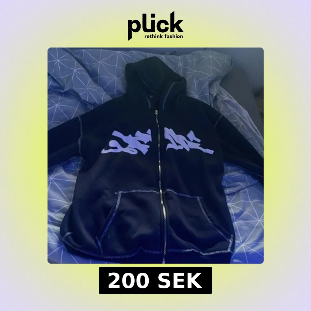 Svart hoodiejacka med dragkedja och stora vita tryck på bröstet. Jackan har huva, synliga sömmar och fickor framtill. Perfekt för en streetwear-look och chill dagar.