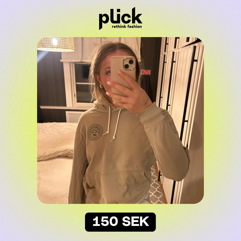 Säljer en beige hoodie med tryck på bröstet och ryggen. Nyskick. Strl 40