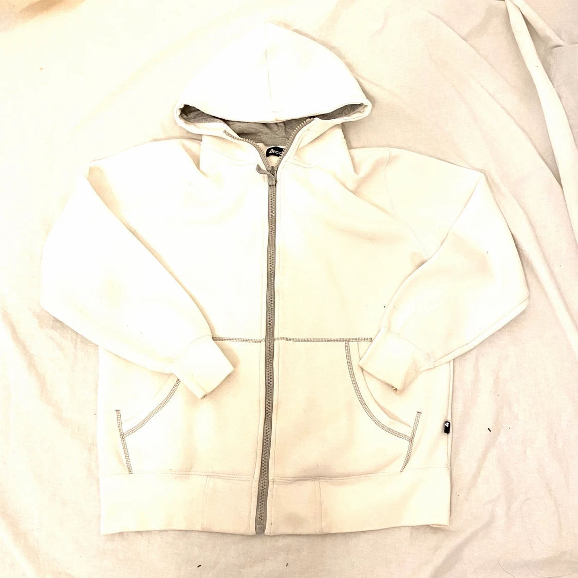 Vit zip hoodie med gråa detaljer, snöret är bort dock! Från 4Code i storlek L men sitter som en Medium