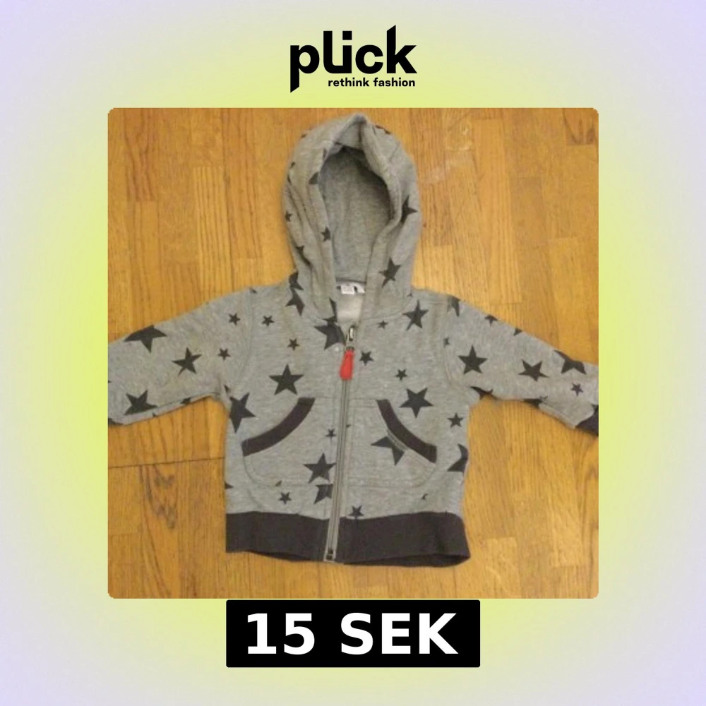 Grå hoodie för barn från Åhléns med svarta stjärnor, huva och dragkedja med röd detalj. Mjukt bomullsmaterial och muddar vid ärmslut och midja. Den har en röd detalj på dragkedjan och två fickor fram. För 4-6 månader Litet hål, se bild 4! Katter finns i hemmet!