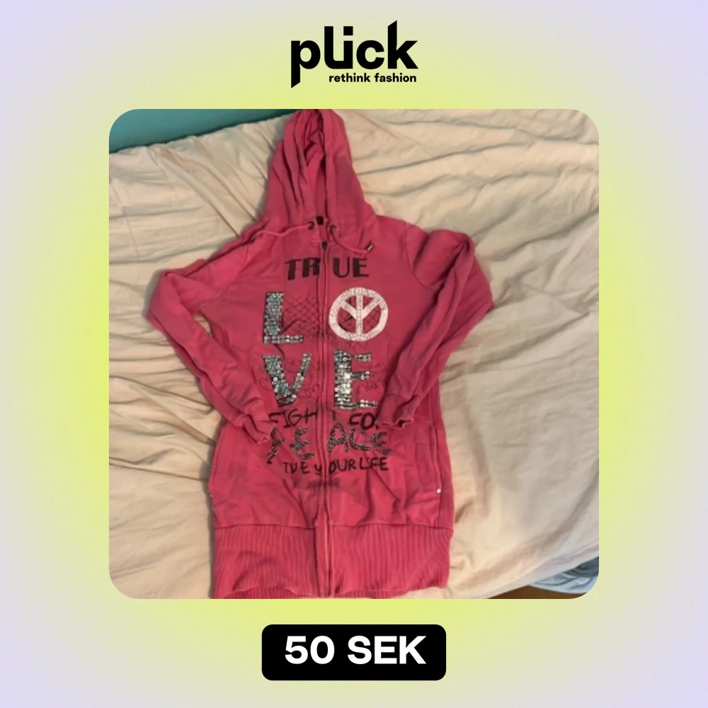 En rosa tjocktröja med text och är lång. Storlek 146/152.