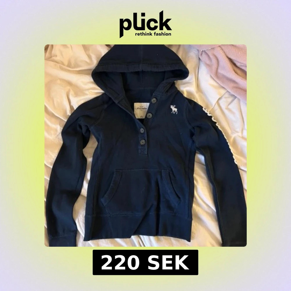 Säljer en mörkblå hoodie från Abercrombie med knappar framtill och en broderad älg på bröstet. Tröjan har långa ärmar med text längs ena ärmen och en praktisk magficka. Perfekt för en avslappnad stil. Det är storlek lx för barn, passar en xs