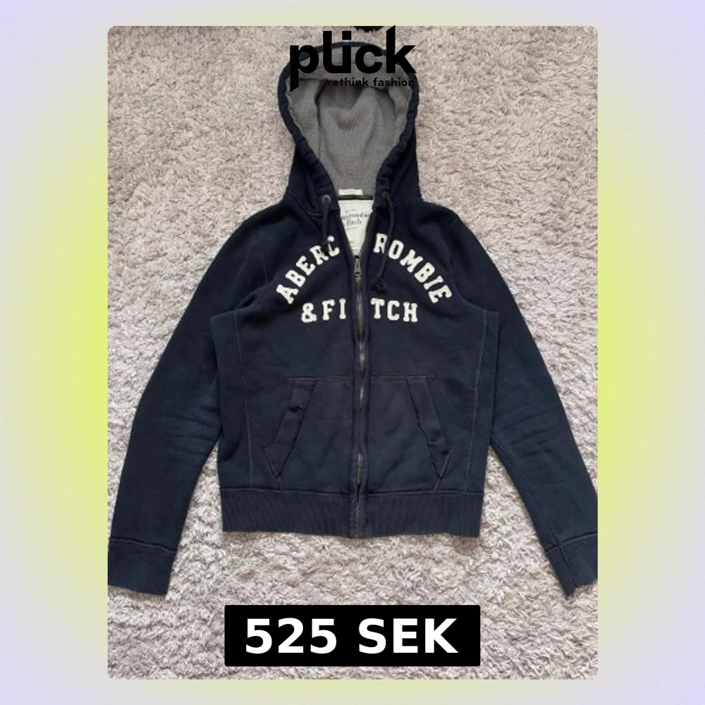 Snygg mörkblå hoodie med dragkedja från Abercrombie & Fitch. Stor vit logga på bröstet, två fickor fram och ribbade muddar. Insidan av huvan är grå och mjuk för extra komfort. Perfekt för en avslappnad och trendig look.