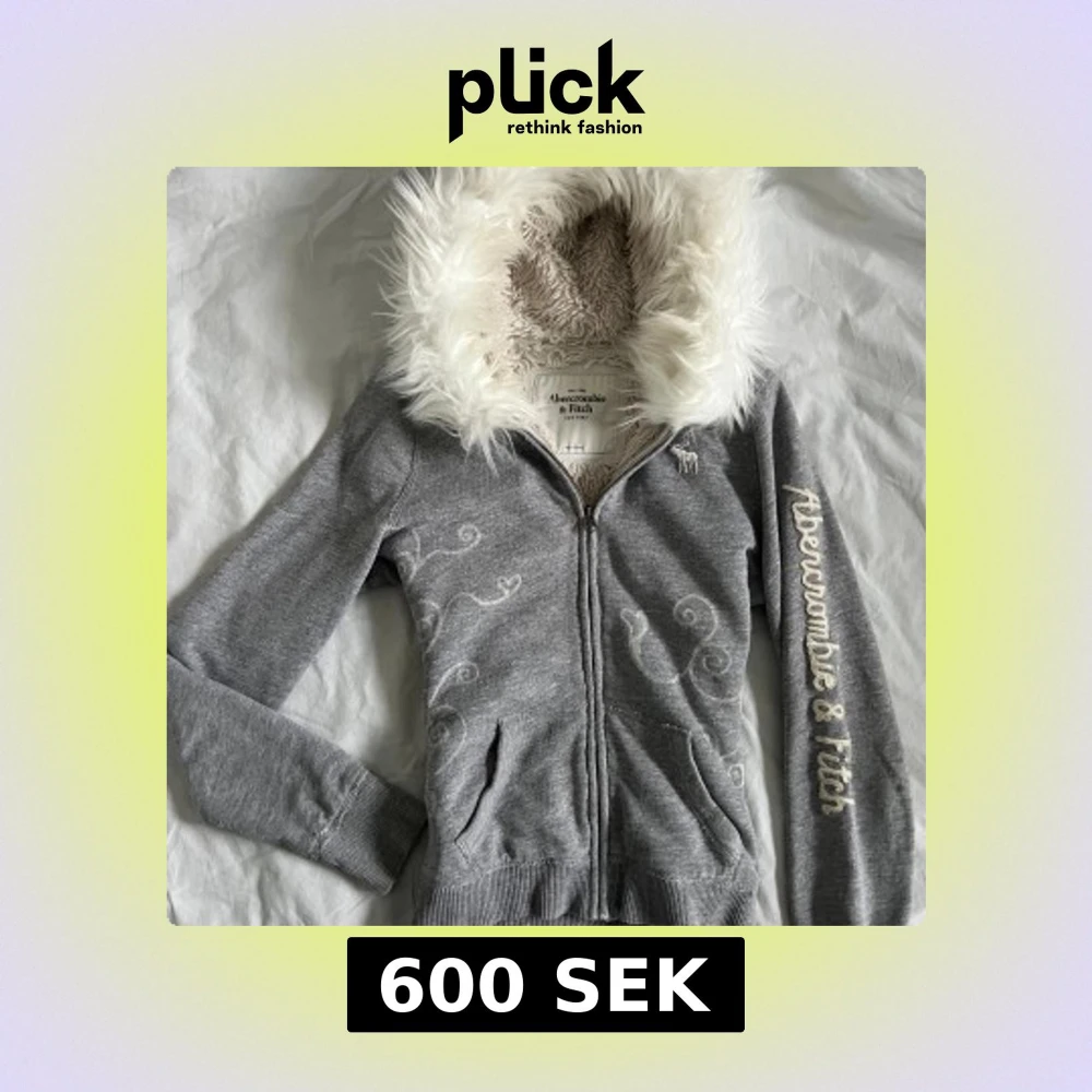 Snygg grå hoodie från Abercrombie & Fitch med fluffig vit fuskpäls i huvan och broderade vita detaljer med hjärtan och stjärnor. Dragkedja framtill, broderad logga på bröstet och stor text på ärmen. Perfekt för kyliga dagar. Vintage storlek L passar S. måtten finns.
