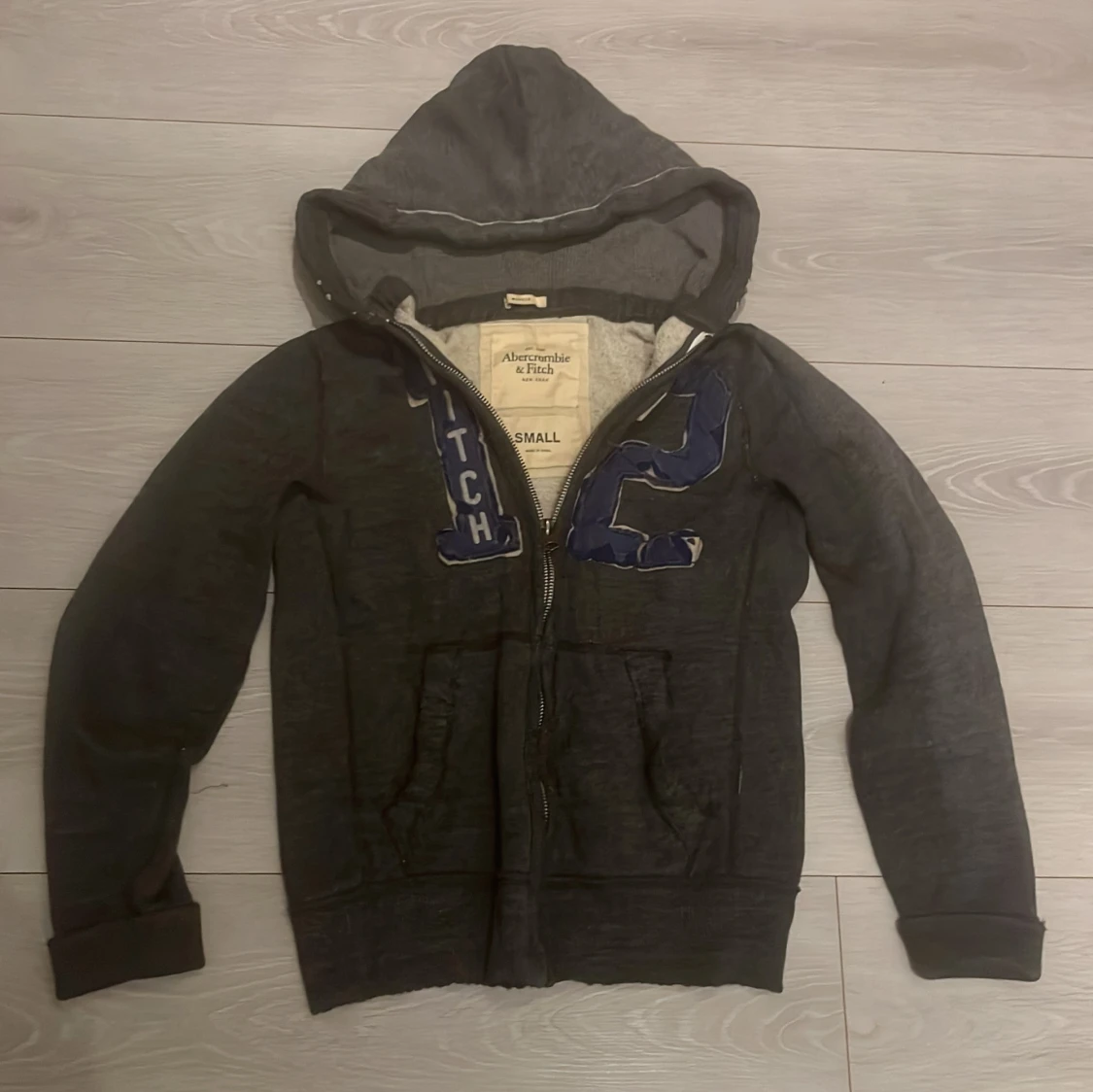 Fet mörkgrå zip up jacka/hoodie från Abercrombie & Fitch, lite sliten här o där men funkar definitivt. Perfekt till hösten som en overshirt, den är lite större än vanligt så jag skulle säga medium storlek