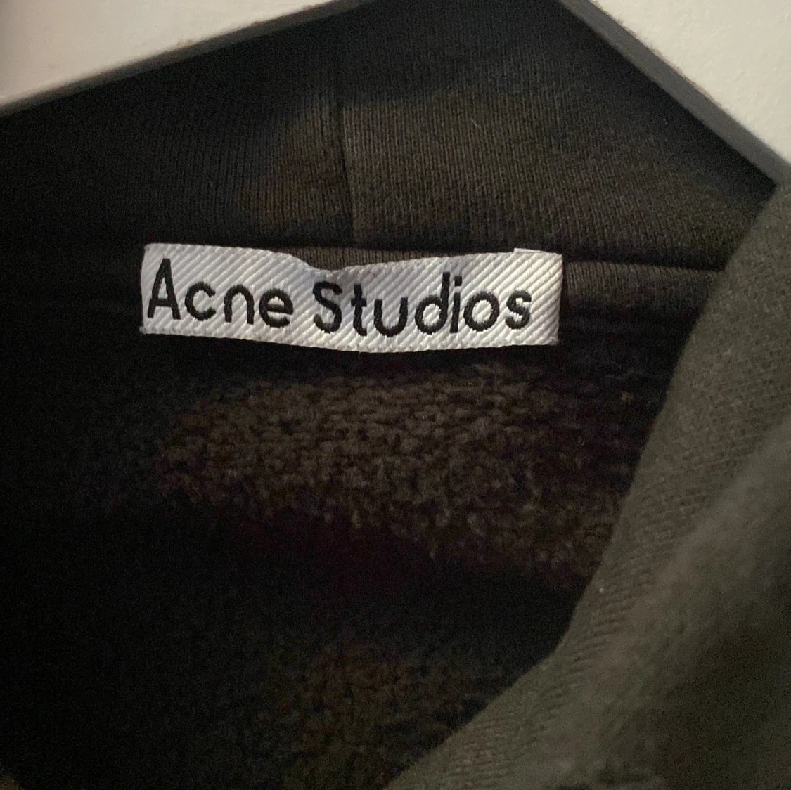 Svart hoodie från Acne Studios med tryck i vitt på ryggen: 'Acne Studios STOCKHOLM 1996'. Klassisk huva och långärmad modell, tillverkad i mjukt bomullsmaterial. Perfekt för dig som gillar stilrena streetwear-plagg med tydlig logga. Storlek S