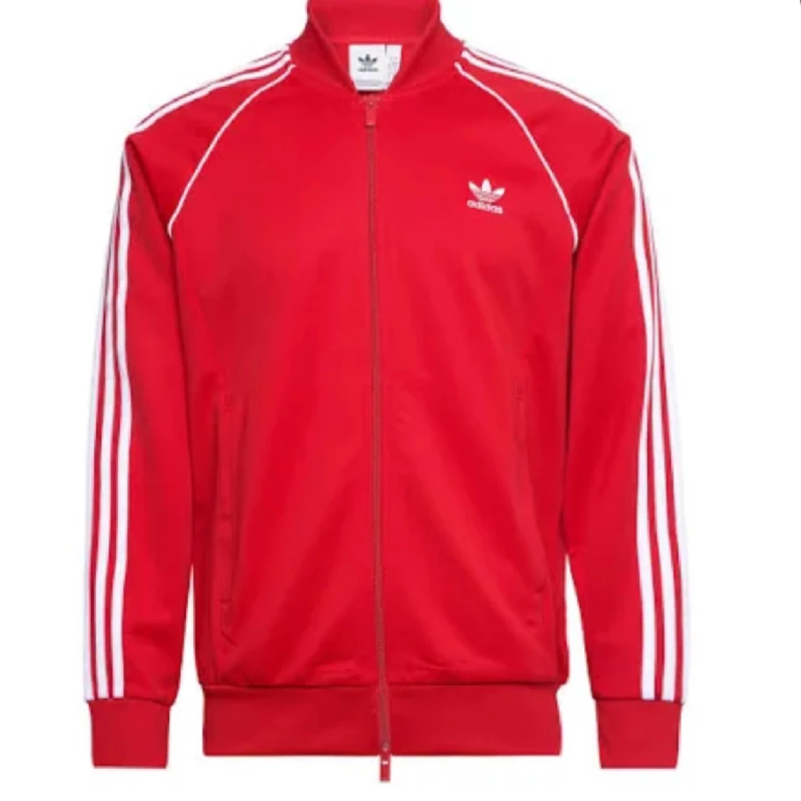 Röd adidas kofta Adidas, helt oanvänd, i nytt skick. Från tjej avdelning men passar på kille oxå.