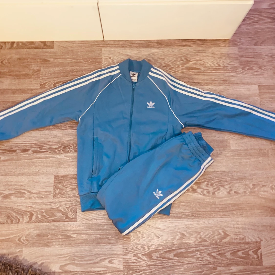 Baby blå Adidas dress, knappt använd, i gott skick. Adidas original, storle S. Super snygg och as skön, säljer pga överflöd av adidas kläder. Frakt ingår ej i priset