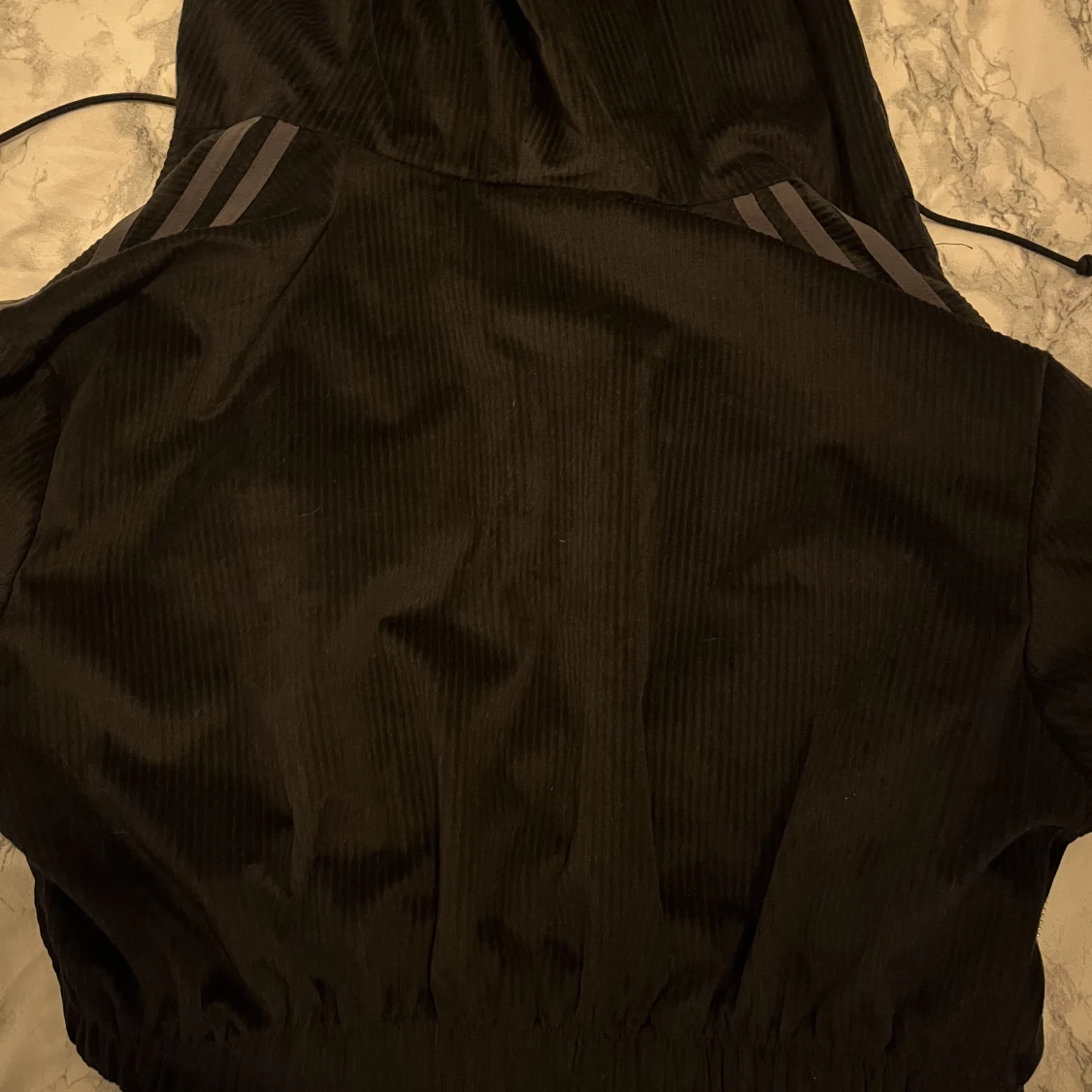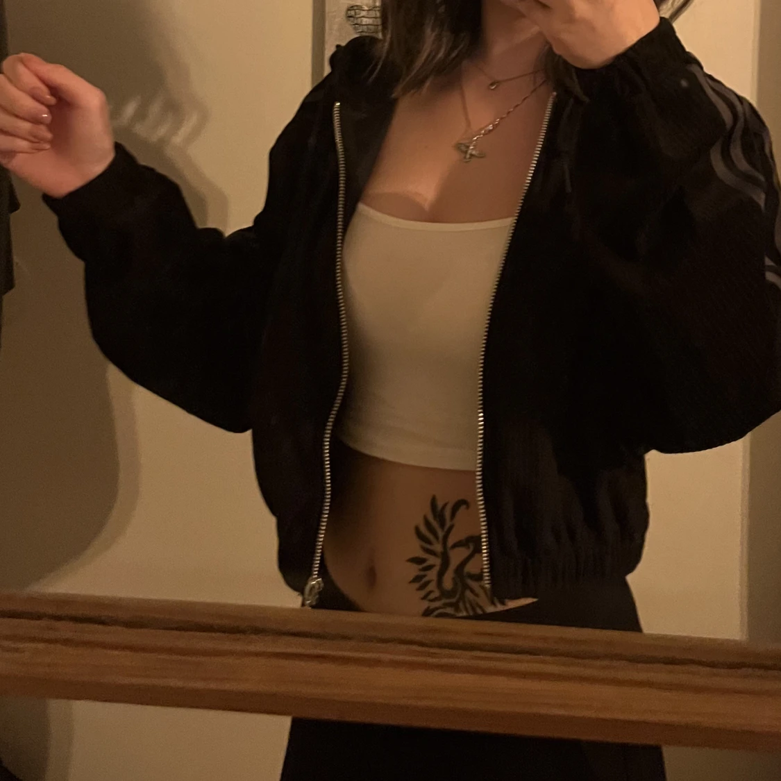 En svart cropped adidas zip hoodie. Den är i storlek 34 och brukar själv bära runt storlek S. Kort hoodie som sagt och inte använd så mycket och på länge.