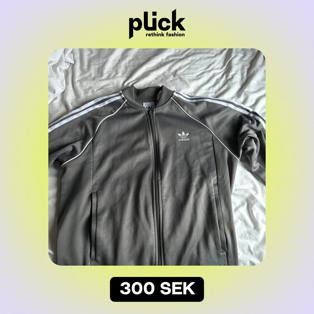 Säljer en grå träningsjacka från Adidas i mycket bra skick. Den har de klassiska tre vita ränderna längs ärmarna och en dragkedja framtill. Perfekt för träning eller som en casual vardagsjacka. Adidas-loggan är broderad på bröstet. Passar till det mesta