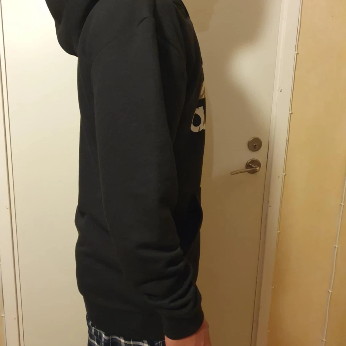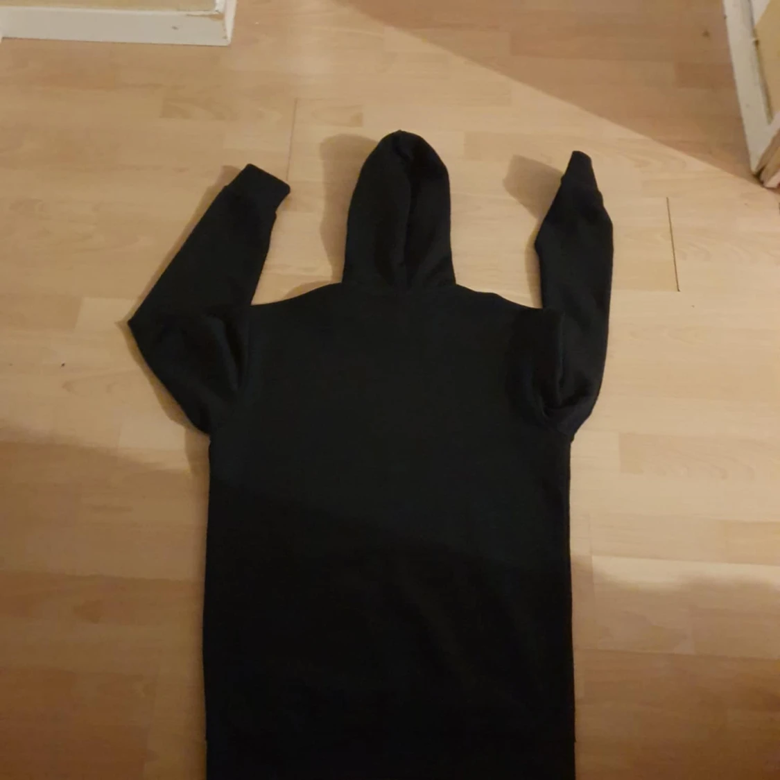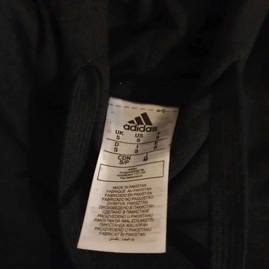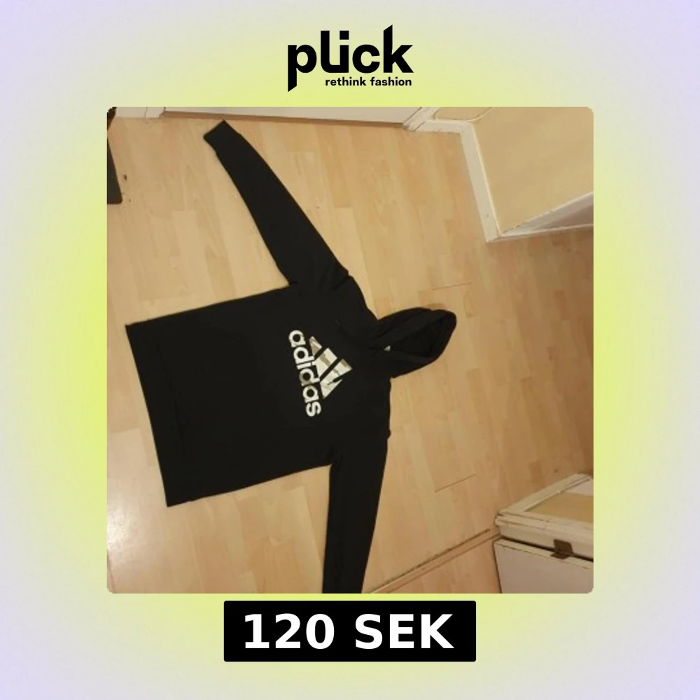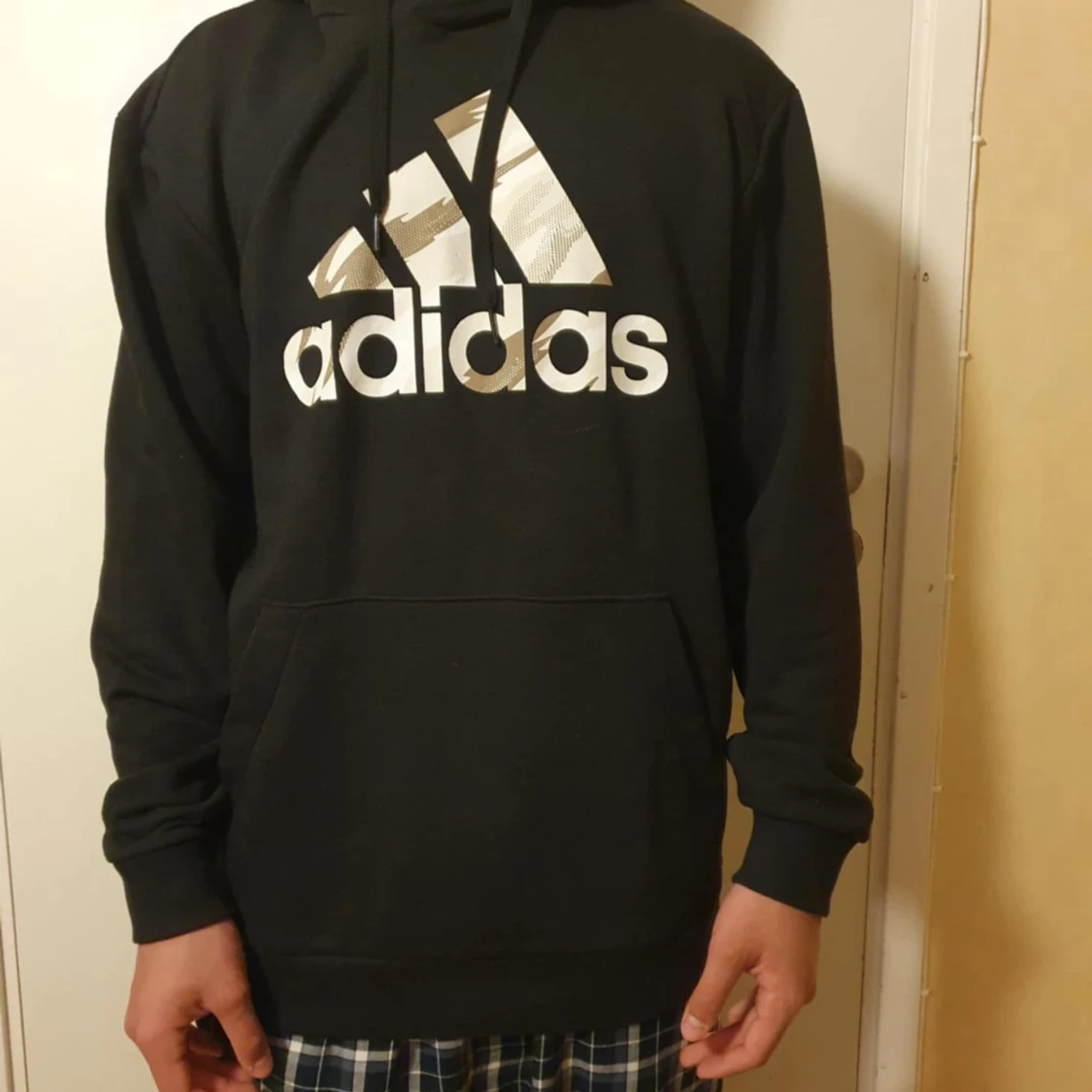 Svart hoodie från Adidas med stor vit logga på bröstet. Klassisk känguruficka framtill, huva med snörning och långa ärmar. Skön passform och perfekt för chill eller träning. Materialet är mjuk bomullsmix som känns nice mot huden.