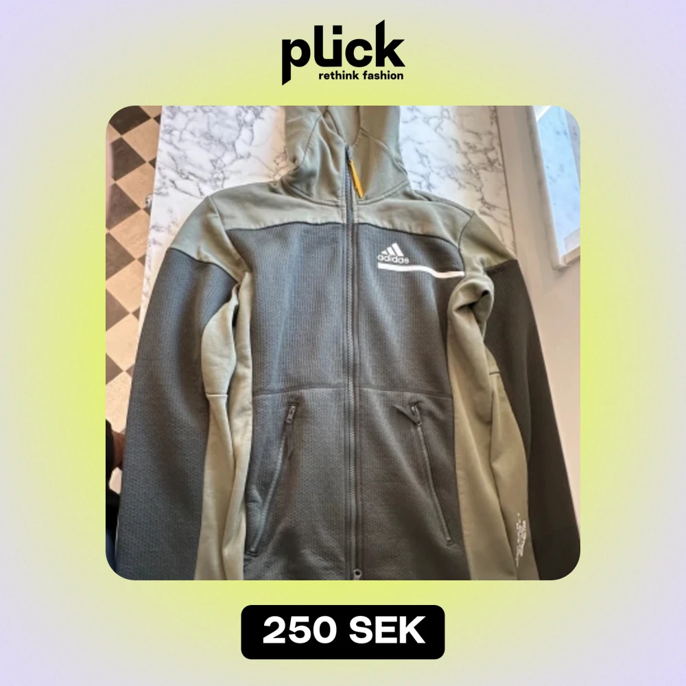 En militärgrön Adidas zip hoodie. Hoodien är luftig och sportig. Kan användas både för träning men även för att använda ute. Den har flera fickor för förvaring av små saker samt en stor luva. Hoodien har endast använts 5-10 gånger och är i gott skick