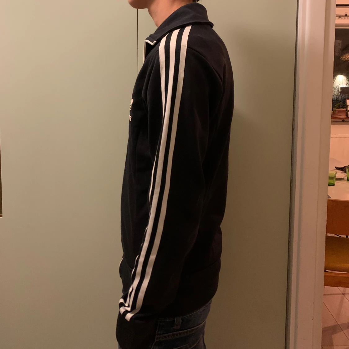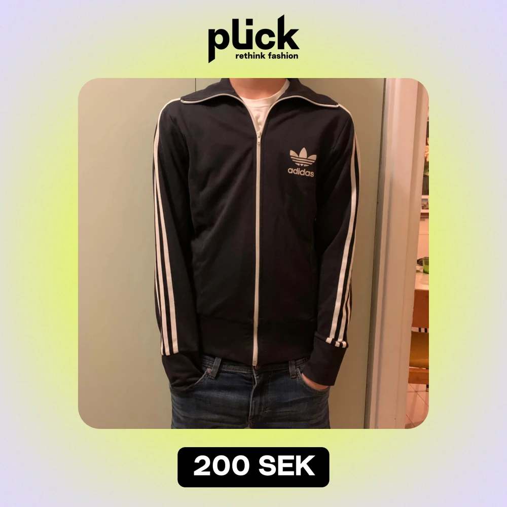 Säljer en klassisk svart träningsjacka från Adidas med vita ränder längs ärmarna och logga på bröstet. Jackan har dragkedja. Den är i bra skick och passar till många olika outfits.