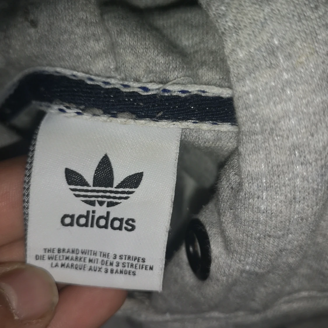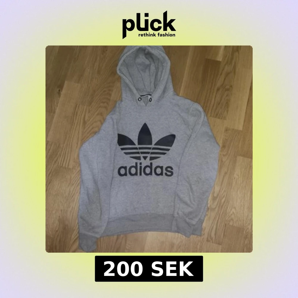 Säljer en grå hoodie från Adidas med stor svart Trefoil-logga på bröstet. Tröjan har huva med snörning och är tillverkad i mjuk bomullsblandning. Perfekt för en chill och sportig stil. Långärmad och med ribbade muddar för extra komfort.