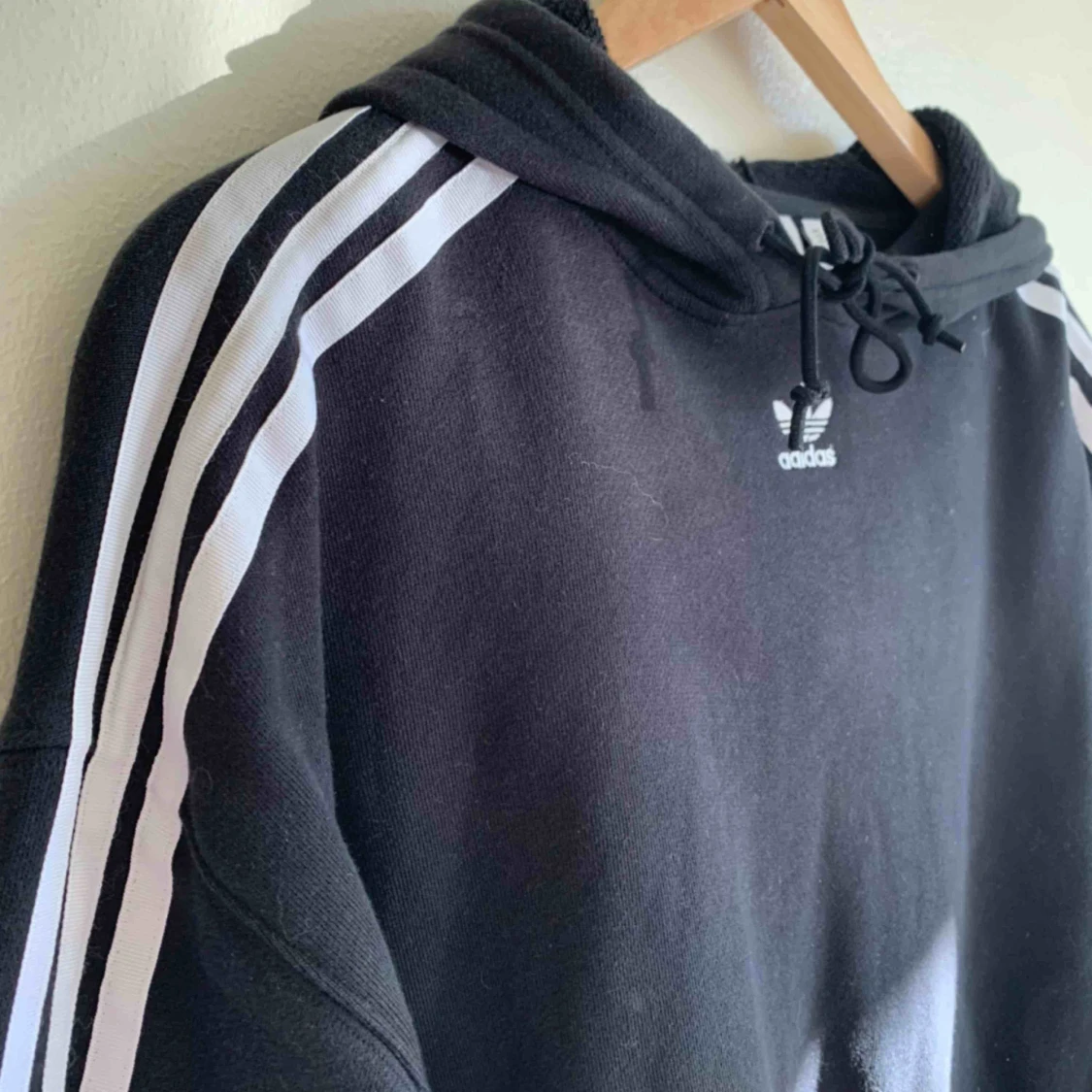 adidas hoodie med sträck på ärmarna och logga framtill. Använd 1 gång därav nyskick! Den är kortare typ "croppad" 🍃