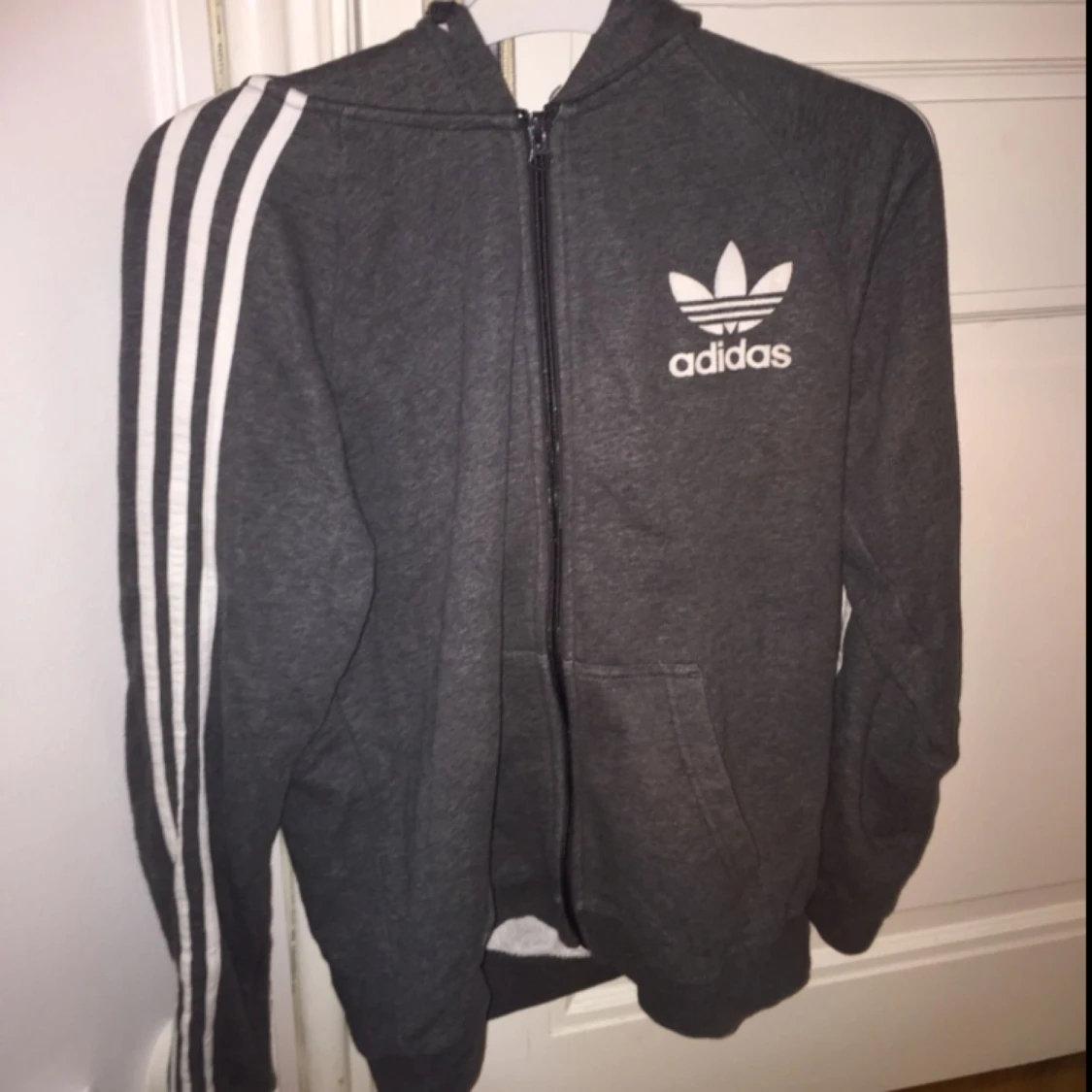 En grå Adidas jacka unisex strl s/m. Nästan oanvänd använd ca 3-5 gånger. Original (äkta från Adidas butiken i mall of Scandinavia)