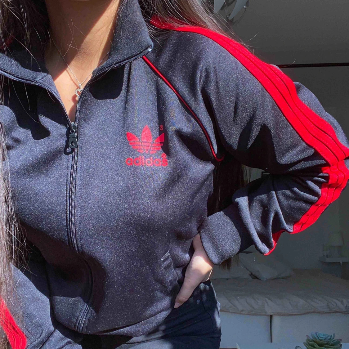 Svart adidas jacka/tröja med röda ränder. Endast använd 2 gånger💘 Det står adidas stort på ryggen med. Skicka DM för bättre bilder. Köp ihop med min röda adidasjacka och få båda för 300kr🥰💘