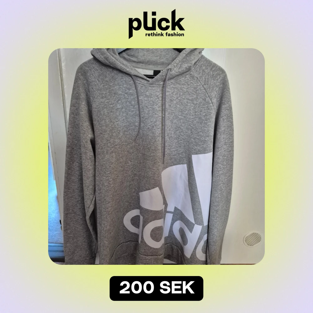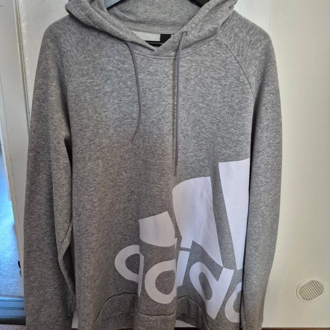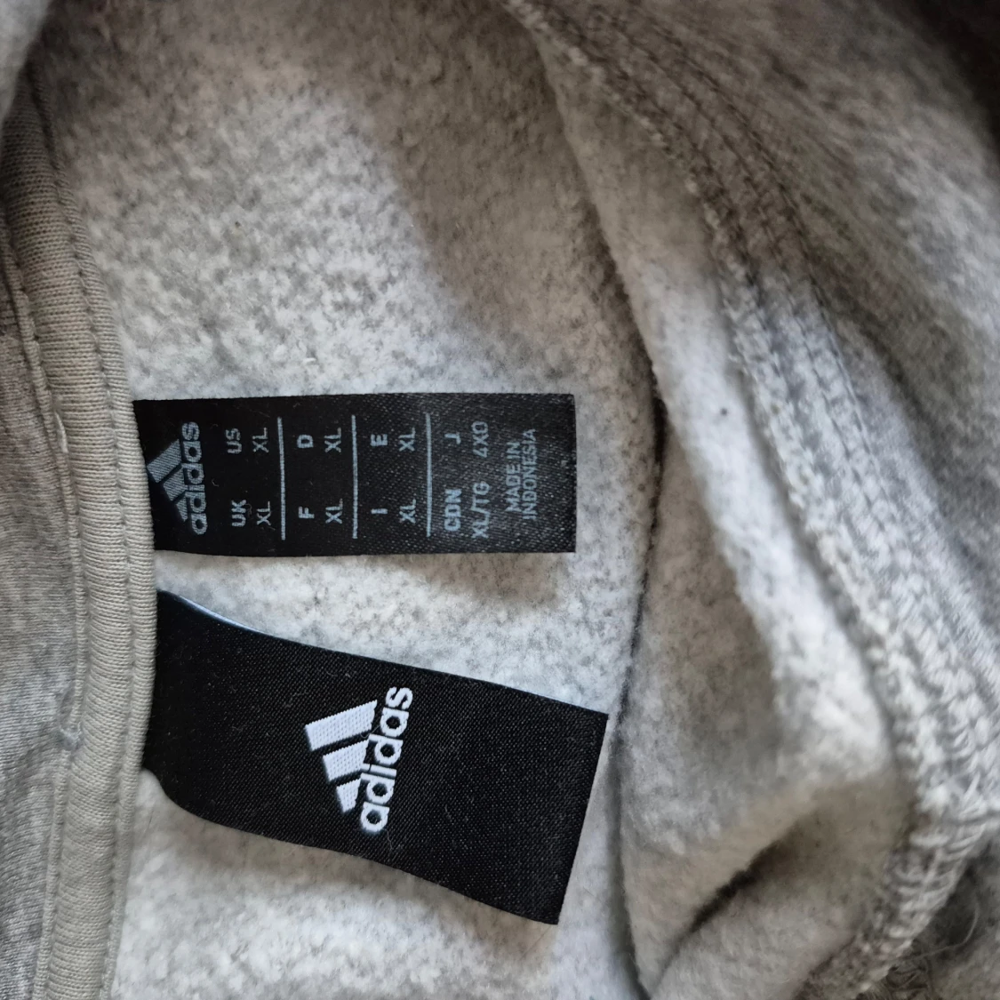 Säljer en snygg och bekväm grå hoodie från Adidas i storlek XL. Den har en stor vit logga på framsidan och är perfekt för både träning och vardag. Hoodien är i mycket bra skick och har en klassisk passform med långa ärmar och en skön huva. Perfekt för höst och vinter!