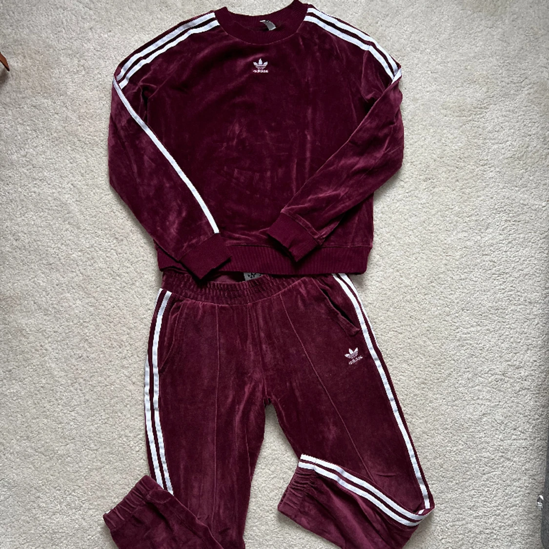 Fin Adidas dress med byxa och tröja i stl S! En fin vinröd färg! Pris för både byxa och tröja 350:- + porto (postnord skicka lätt) Kan mötas i Uppsala annars skickar jag kläderna!