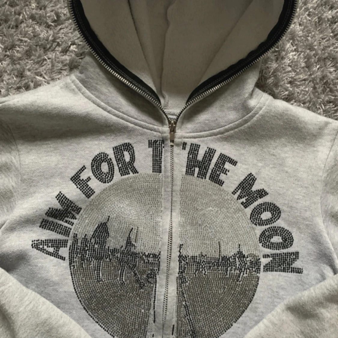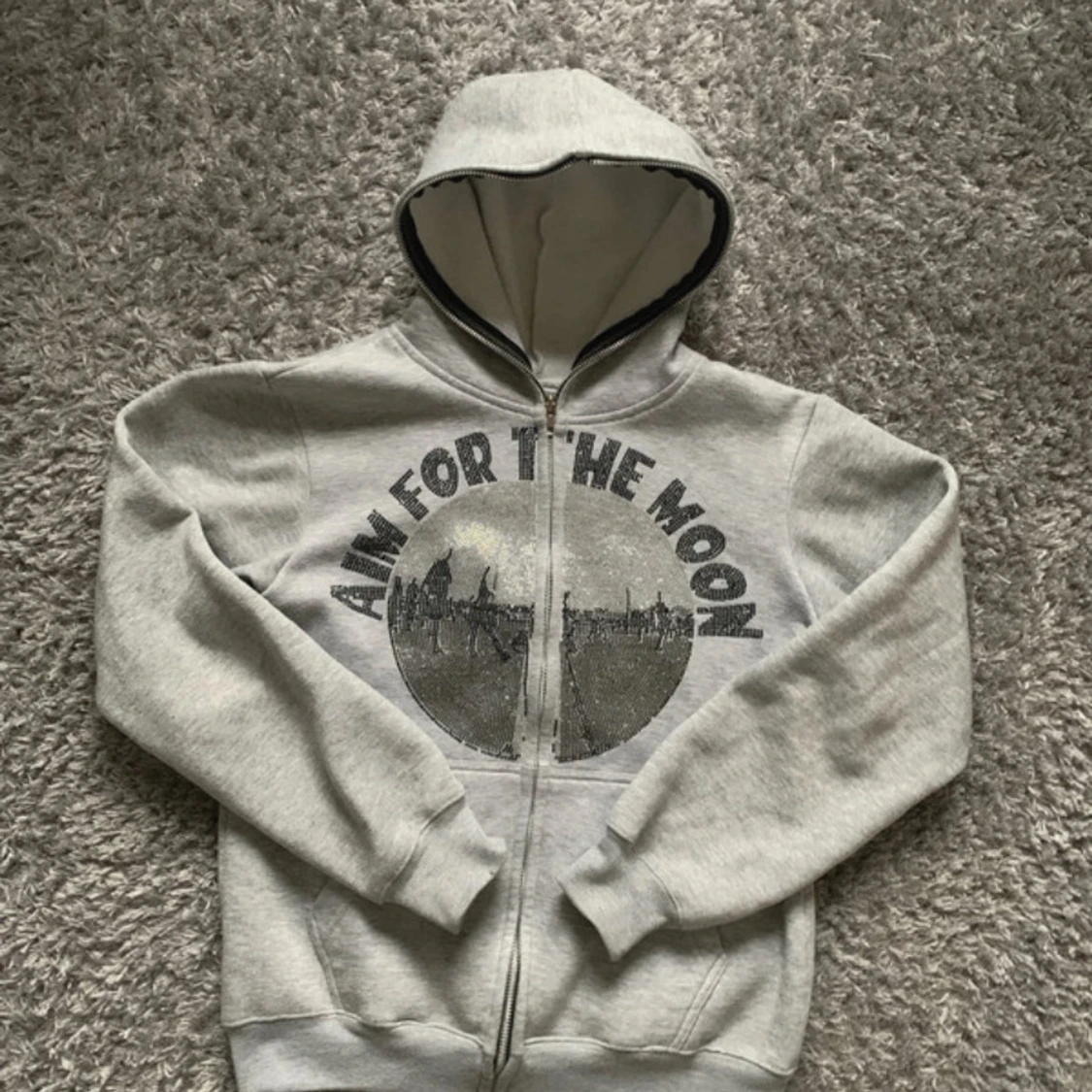 Säljer denna grå Aim for the Moon hoodie. Den har en dragkedja och är perfekt för både höst och vår. Alla stenar är inte kvar. Superbekväm och stilren. Hoodien är rare, och slutsåld så det går inte att få den ny.