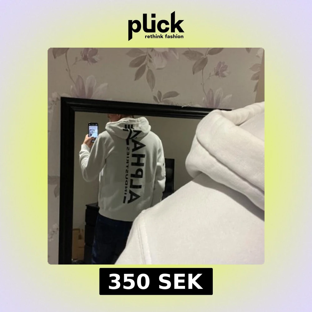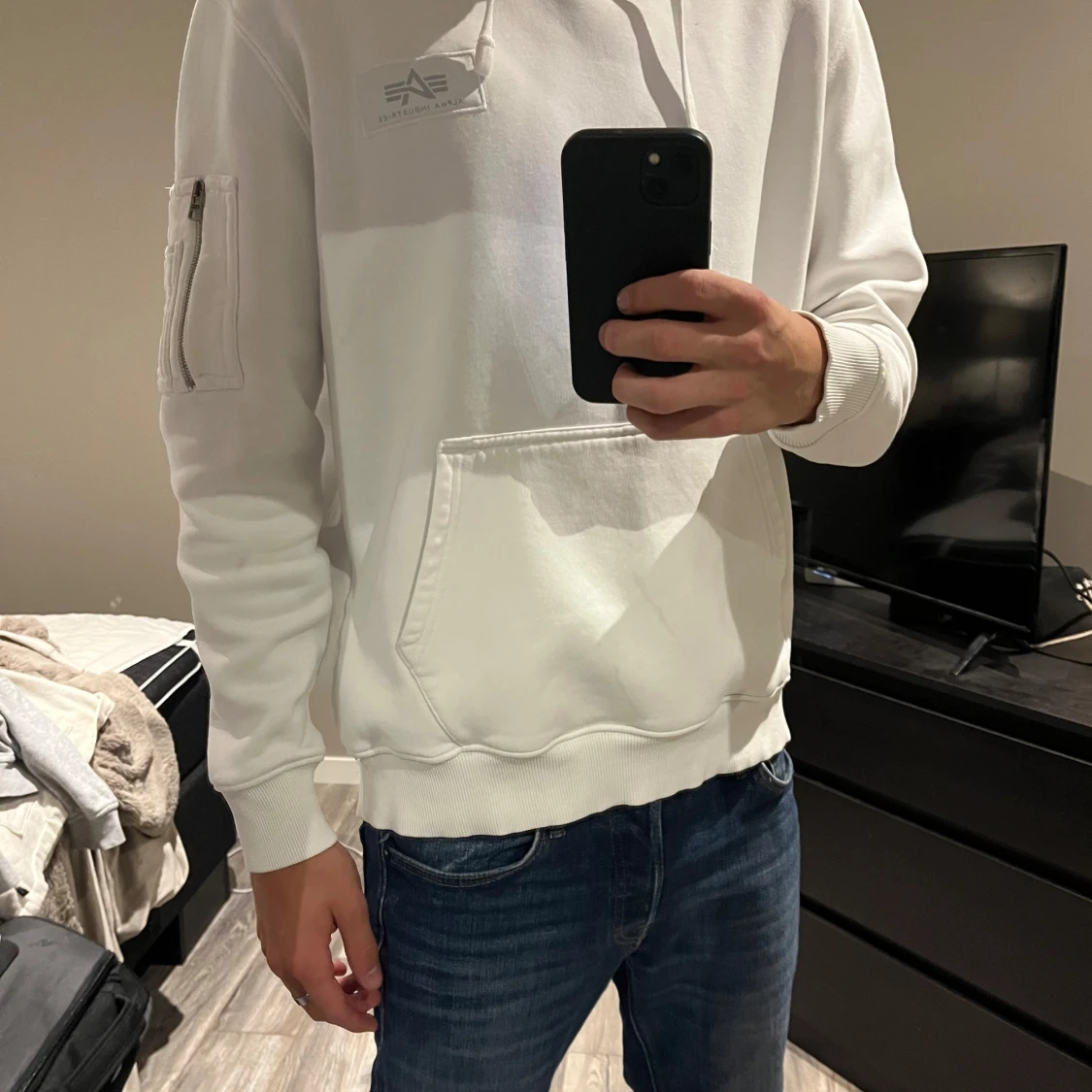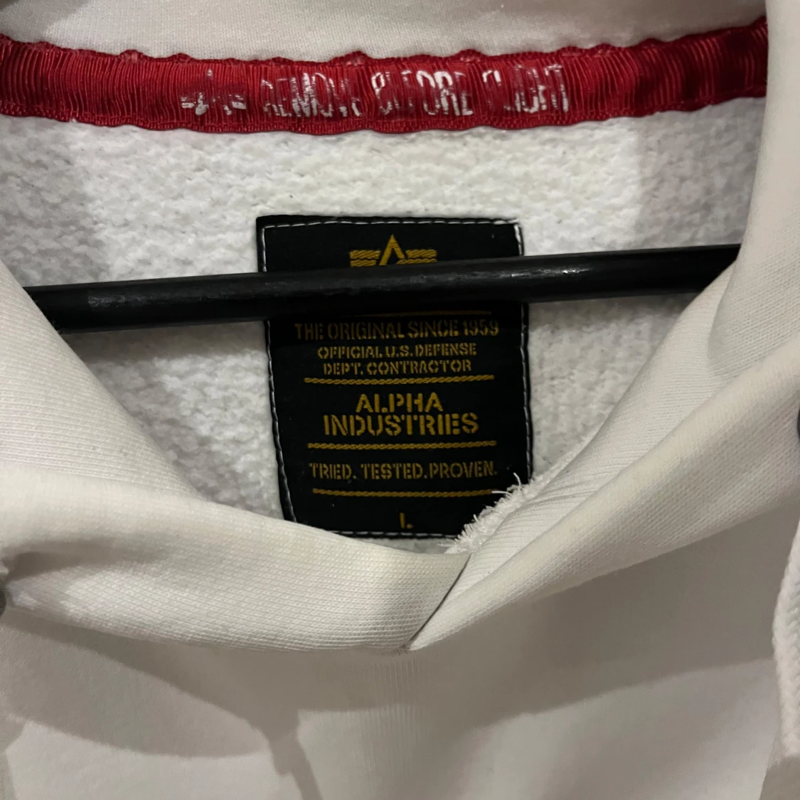 Alpha Industries hoodie med svart camoflauge logga på ryggen. Lite slitage vid snörningen samt fläck på magen. Annars bra skick. Storlek L men passar mig som vanligtvis har M/S
