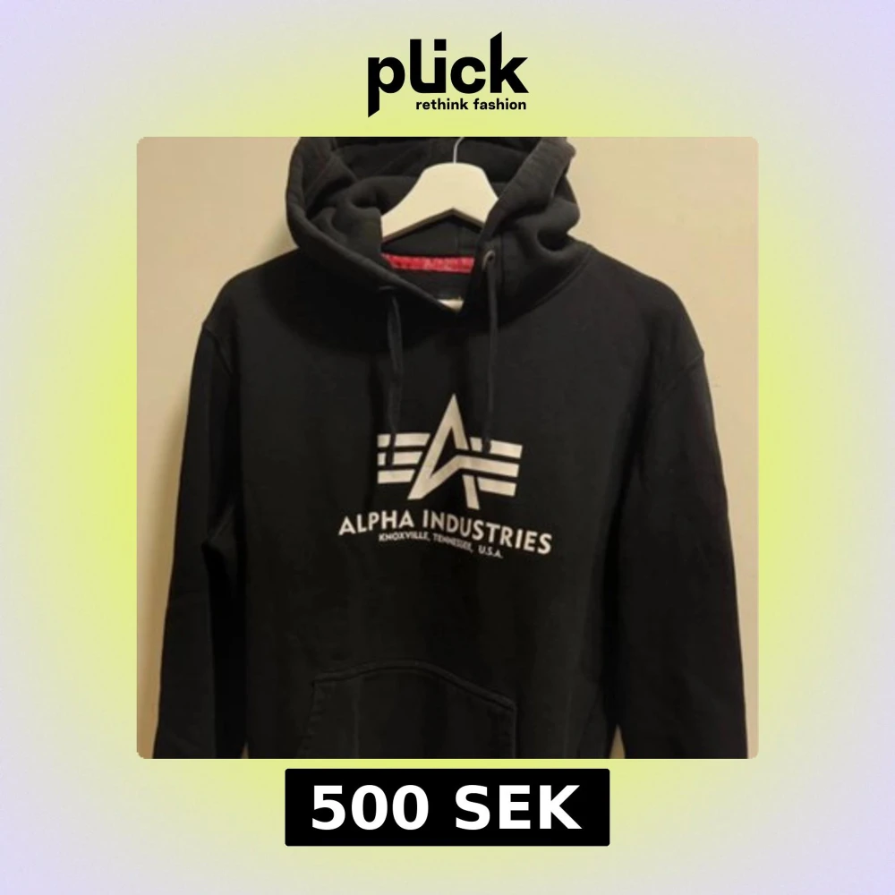 Svart hoodie från Alpha Industries med vit logga och text på bröstet. Tröjan har huva med snörning och en stor magficka framtill. Perfekt för dig som gillar streetwear och vill ha en stilren look.