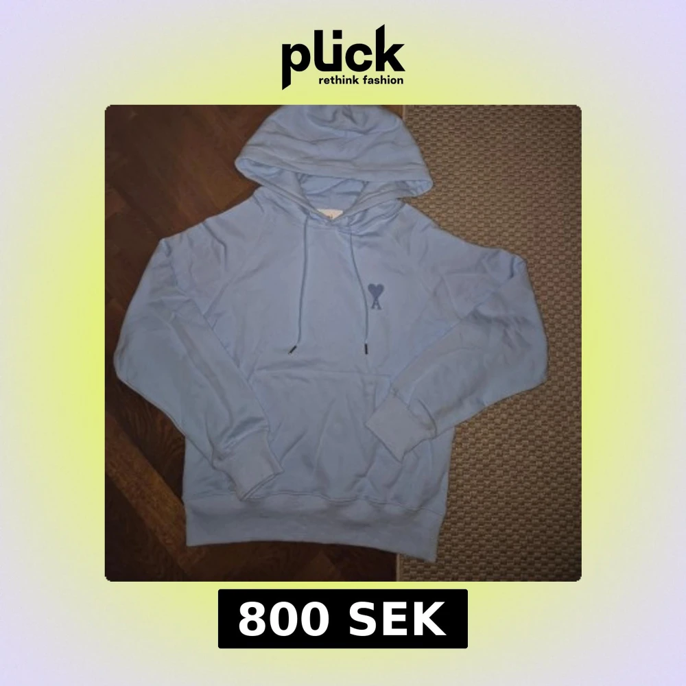 Säljer en snygg ljusblå hoodie från Ami Paris med klassisk huva och snörning. Tröjan har en broderad logga med hjärta och A på bröstet samt ribbade muddar. Perfekt för en chill och stilren look.