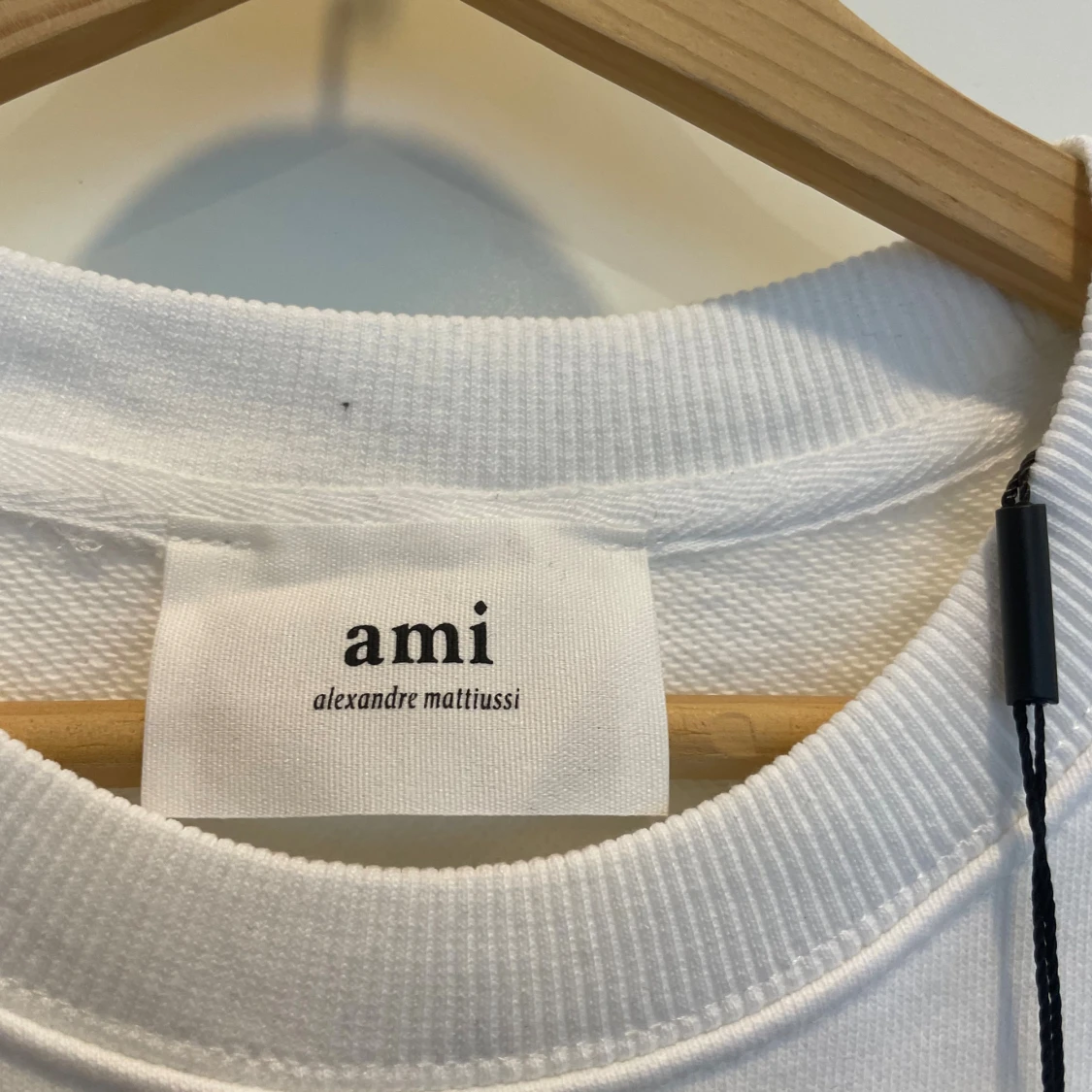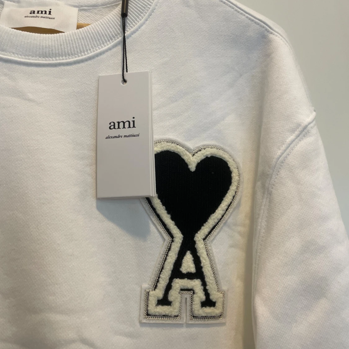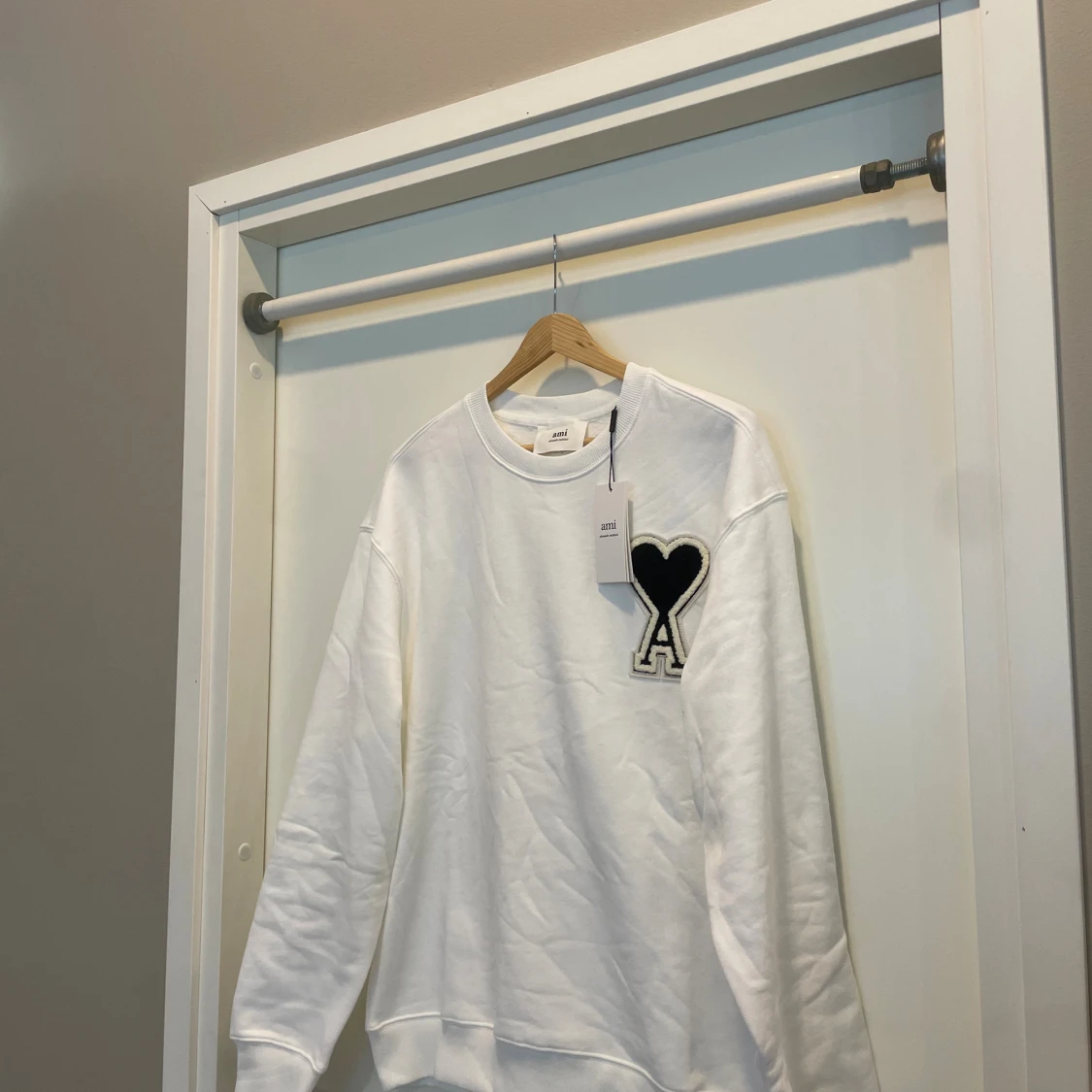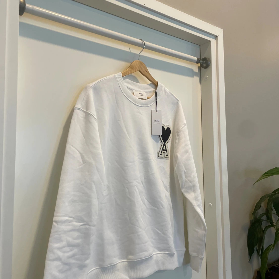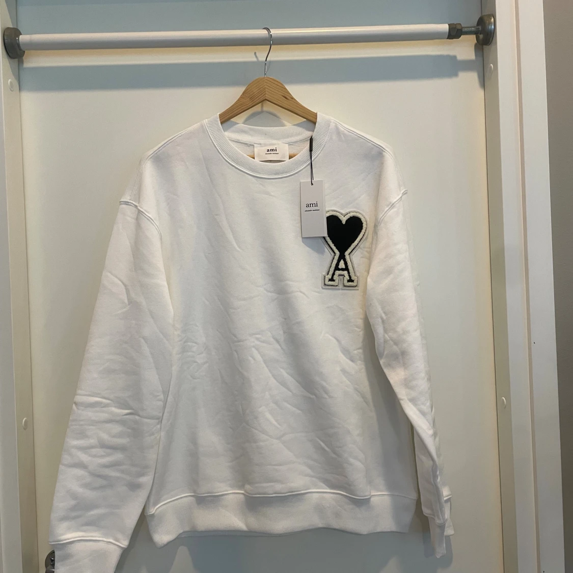 Vit sweatshirt från Ami Alexandre Mattiussi med stor svart hjärtdetalj och bokstaven A broderad på bröstet. Tröjan har rund hals, ribbade muddar och är tillverkad i mjuk bomull. Perfekt för dig som gillar stilrena och coola detaljer.