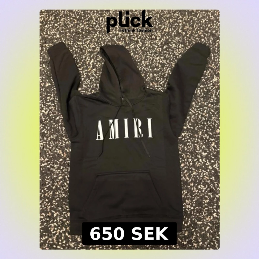 Svart hoodie från Amiri med stort vitt logotryck på bröstet. Klassisk modell med huva och dragsnören, samt en stor magficka framtill. Materialet ser ut att vara mjukt och bekvämt, perfekt för en avslappnad och cool look. Passar också storlek M eftersom den är liten i storlek