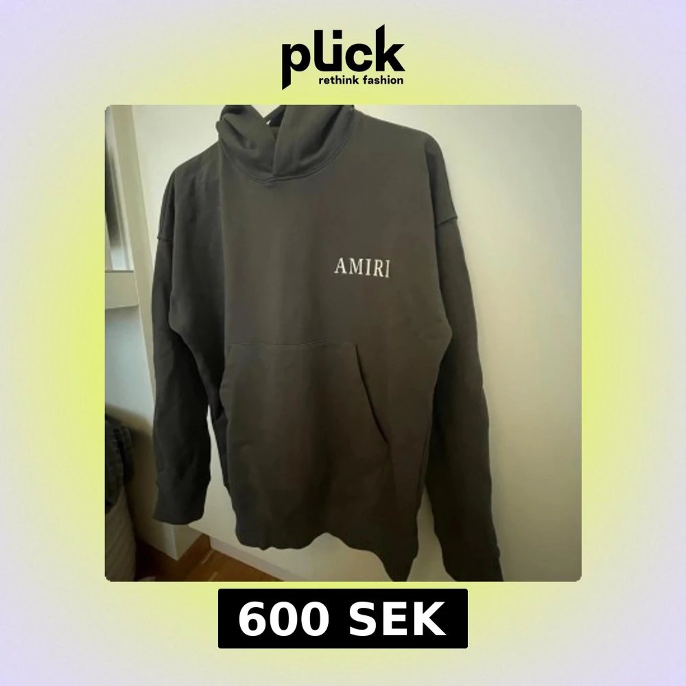 Säljer en mörkgrå hoodie från Amiri med stor vit logga på bröstet och ett fett ängeltryck på ryggen. Hoodien har huva, magficka och långa ärmar. Perfekt för dig som gillar streetwear och vill sticka ut med snygg design.