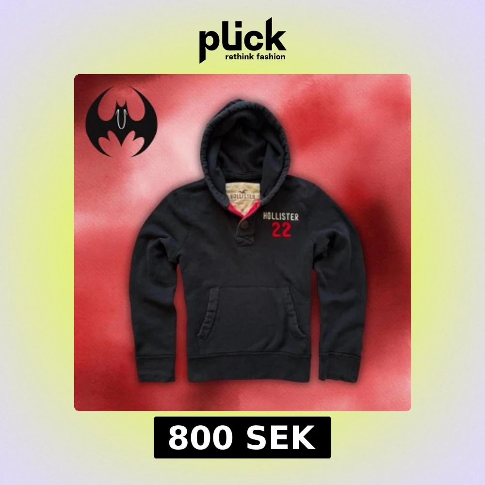 Svart hoodie med tryck och broderat vitt Hollister-tryck och röd siffra 22 på bröstet, ingen snöre | size M | längd: 65cm Axelbredd: 52cm Armlängd: 68cm | Passar för 165-185 cm