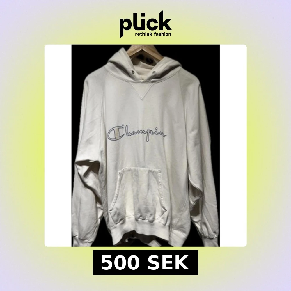 Säljer en vintage vit hoodie från Champion med blått broderat märke på bröstet. Från 80/90 talet. Den har en boxy passform och perfekt för en avslappnad look. Påminder om yeezy gap hoodies me passformen