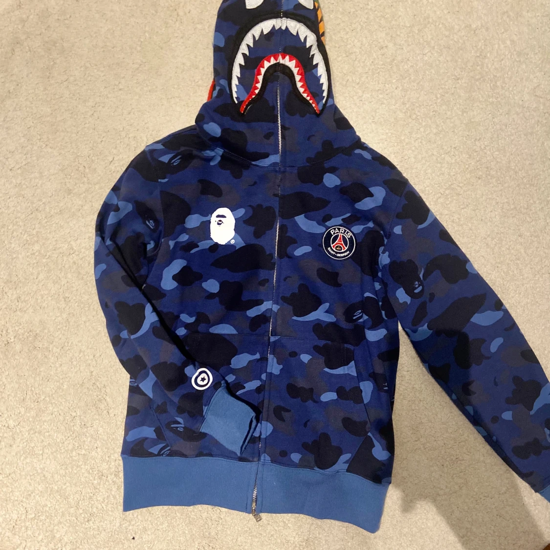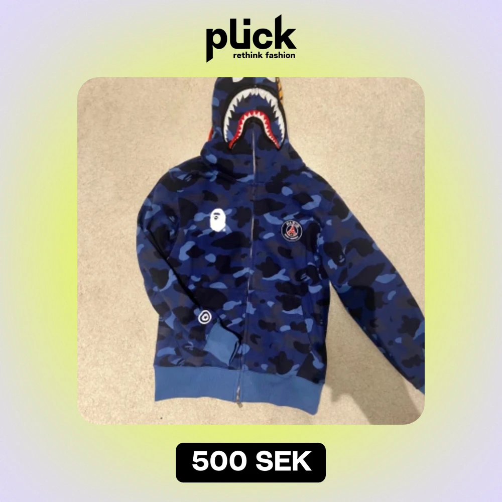 Bape PSG Zip Hoodie, inte använda, prislappen kvar, bape påsen också kvar. Skriv vid andra frågor. Inte plastig material, det står M men jag skulle säga att det är Stor S