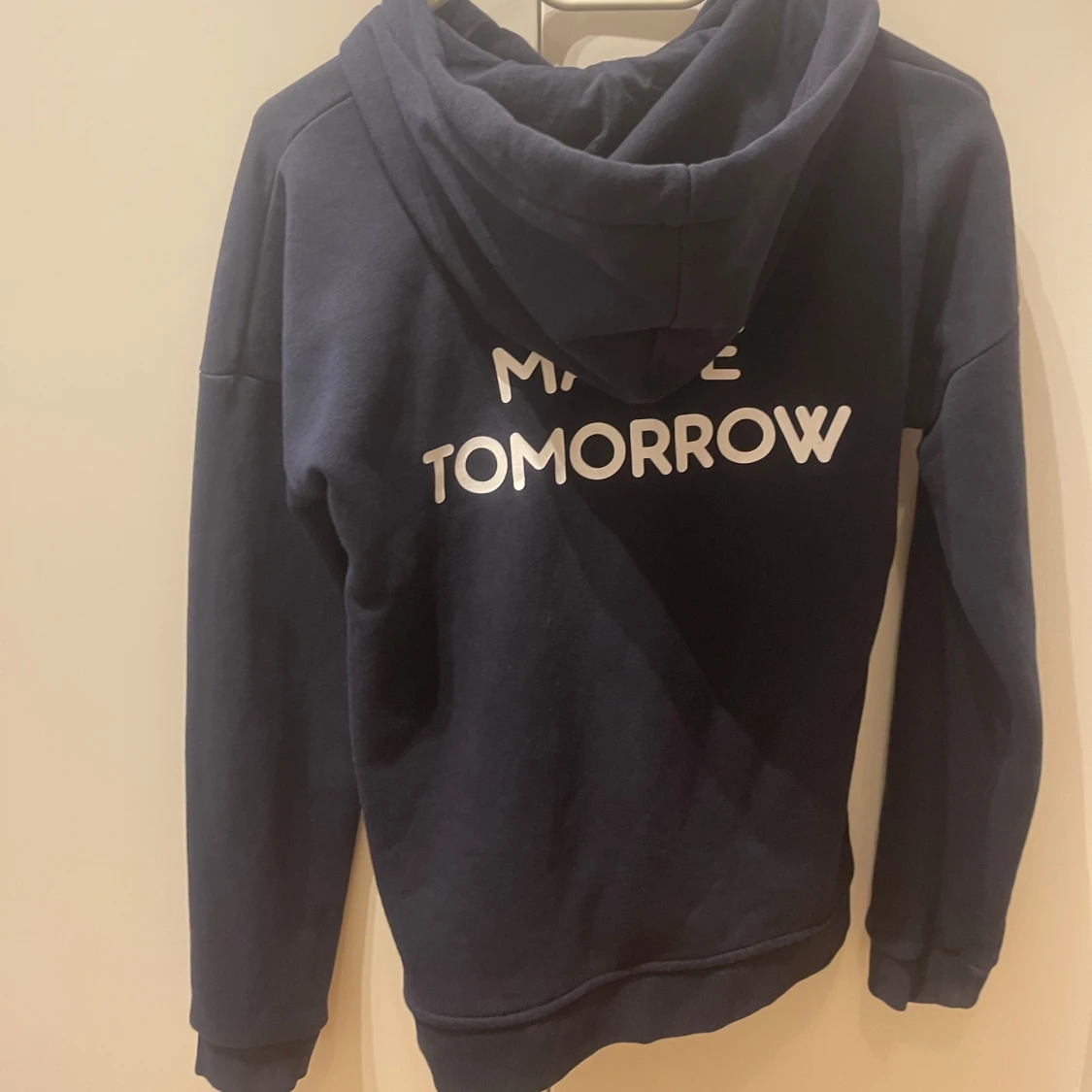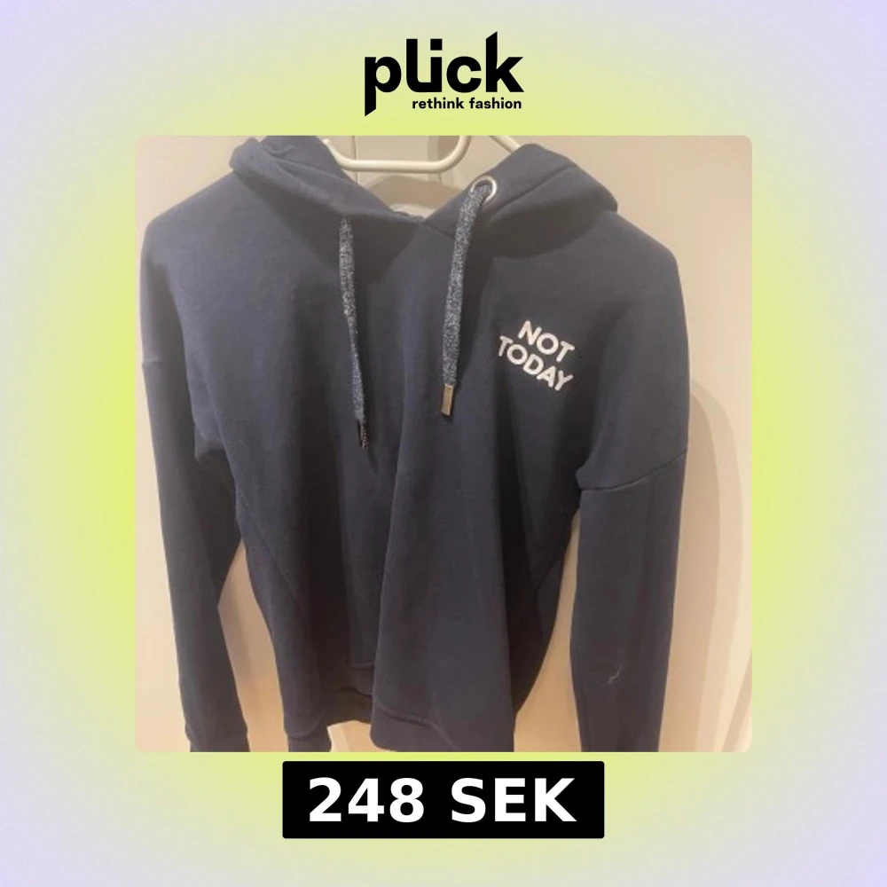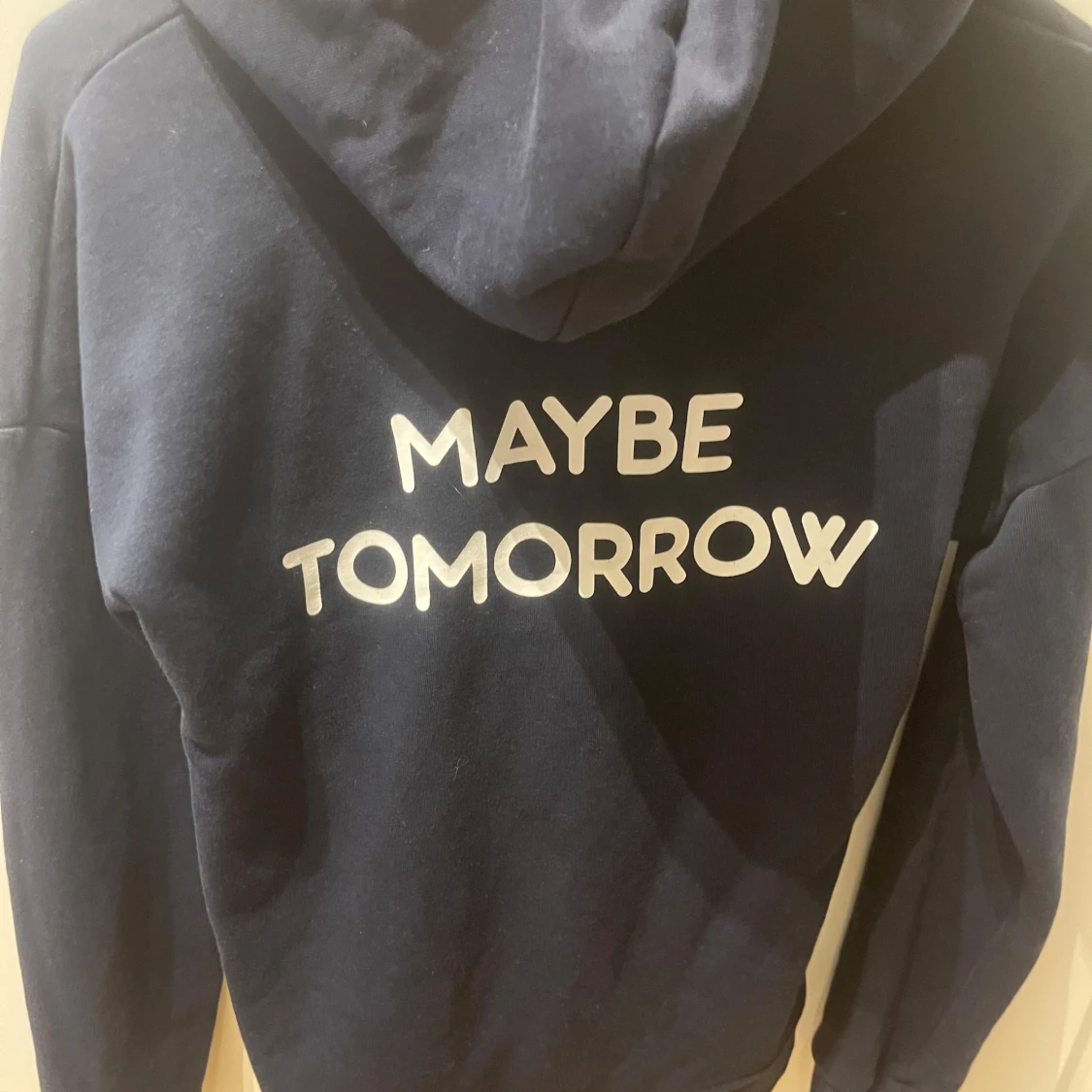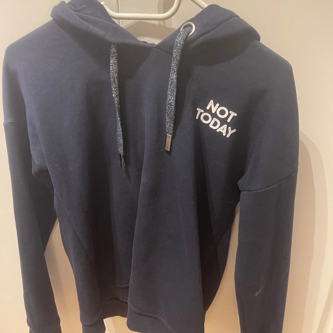 Säljer en mörkblå hoodie med huva och glitter snören☺️ bröstet står det 'NOT TODAY' och på ryggen 'MAYBE TOMORROW'.Perfekt för chill och nice vibe stil 💕💕