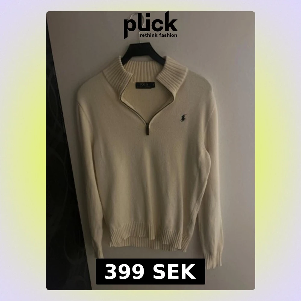 Snygg beige stickad tröja från Polo Ralph Lauren med half zip. Storlek S . Är trasig löngst ut på armen på vänster sidan.