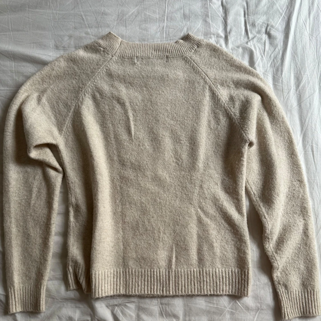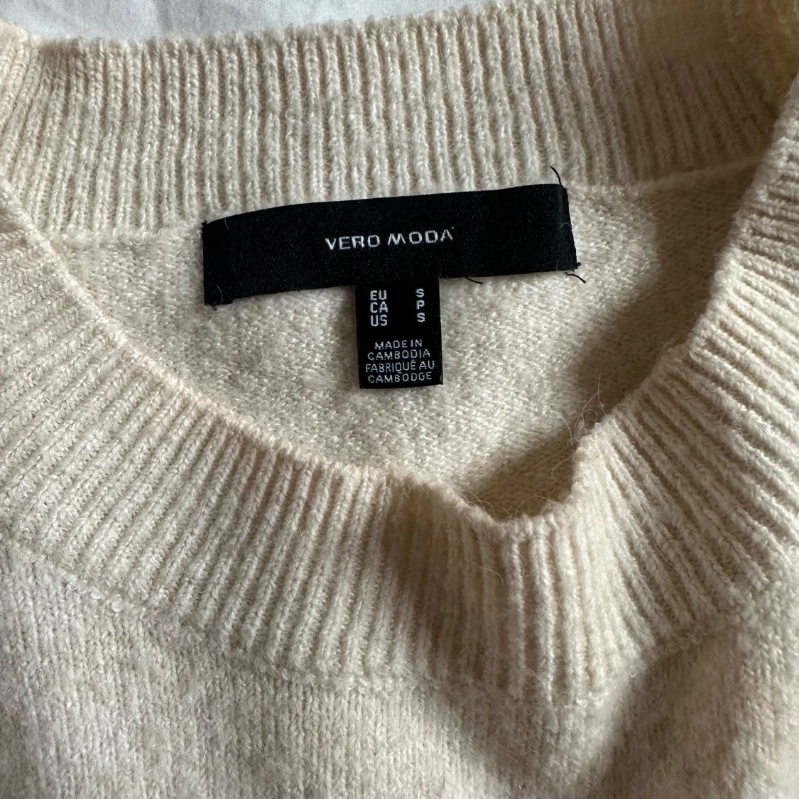 Mysig beige stickad tröja från Vero Moda i storlek S. Tröjan har rund halsringning, ribbade muddar och en enkel, klassisk design som är lätt att matcha. Perfekt för lager-på-lager under kyliga dagar. Använt en gång.