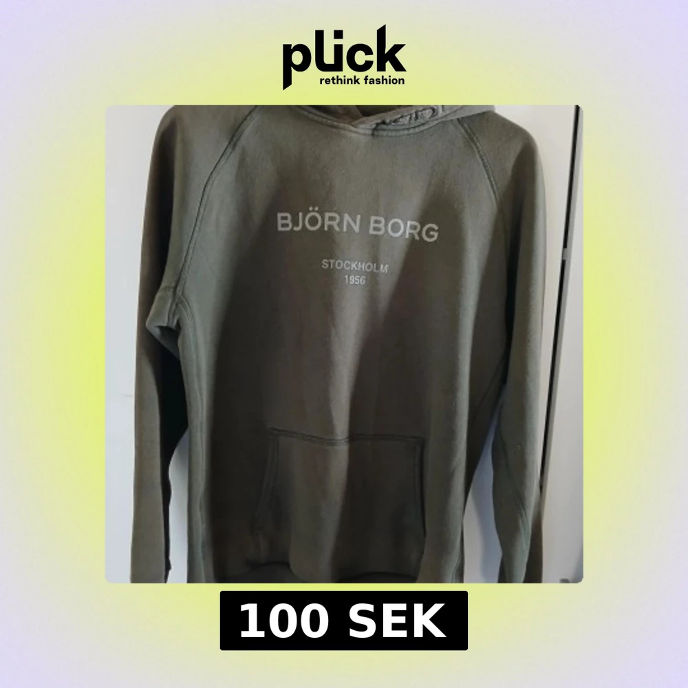 Olivgrön hoodie från Björn Borg med tryck på bröstet med klassisk känguruficka och en bekväm huva. Finns några noppror som syns på bilder.