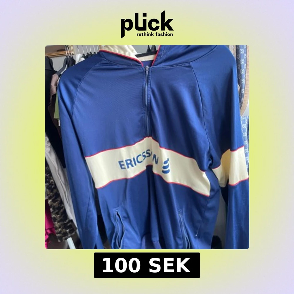 Sportig blå huvtröja från Ericsson med vit och röd detalj över bröstet och ärmarna. Jackan har halv dragkedja framtill, huva och två fickor med dragkedja. Tillverkad i glansig polyester, perfekt för utomhusaktiviteter eller träning. Fläckar på baksida ärm.