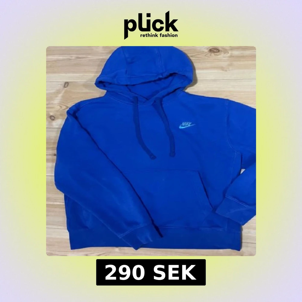 Säljer en snygg blå hoodie från Nike med klassisk logga på bröstet. Tröjan har en stor huva med dragsko och en praktisk magficka. Perfekt för en avslappnad stil.