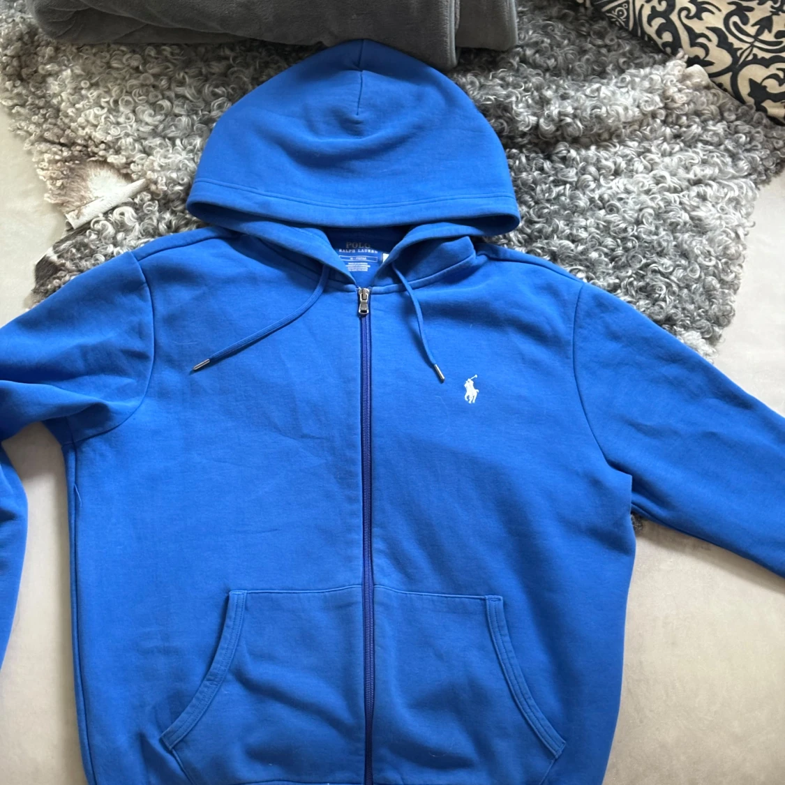 Snygg blå hoodie från Polo Ralph Lauren med dragkedja och klassisk huva. Tröjan har vit broderad logga på bröstet, känguruficka och justerbar snörning i huvan. Perfekt för chill dagar eller när du vill ha en clean streetstyle. Nypris runt 2000kr