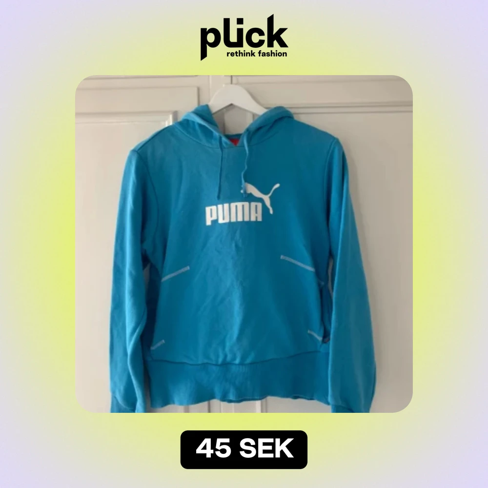 Säljer en snygg och bekväm blå hoodie från Puma. Den har en klassisk design med en stor logga på framsidan och en praktisk huva med dragsko. Perfekt för både vardag och träning! Lite kortare modell. I fint använt skick.