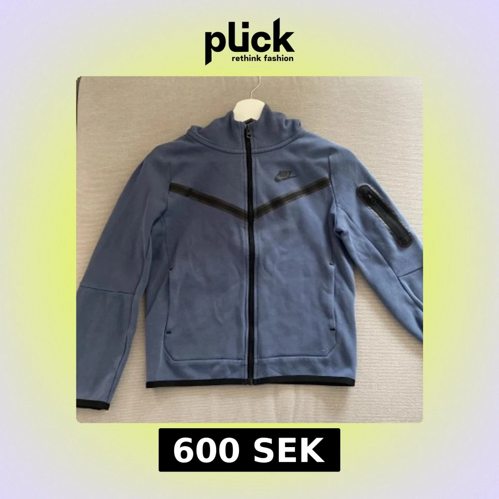 Säljer en blå jacka från Nike med dragkedja och huva. Jackan har en ficka med dragkedja på ärmen och svarta detaljer. Storleken står på etiketten. Den har använts några gånger men är som ny.