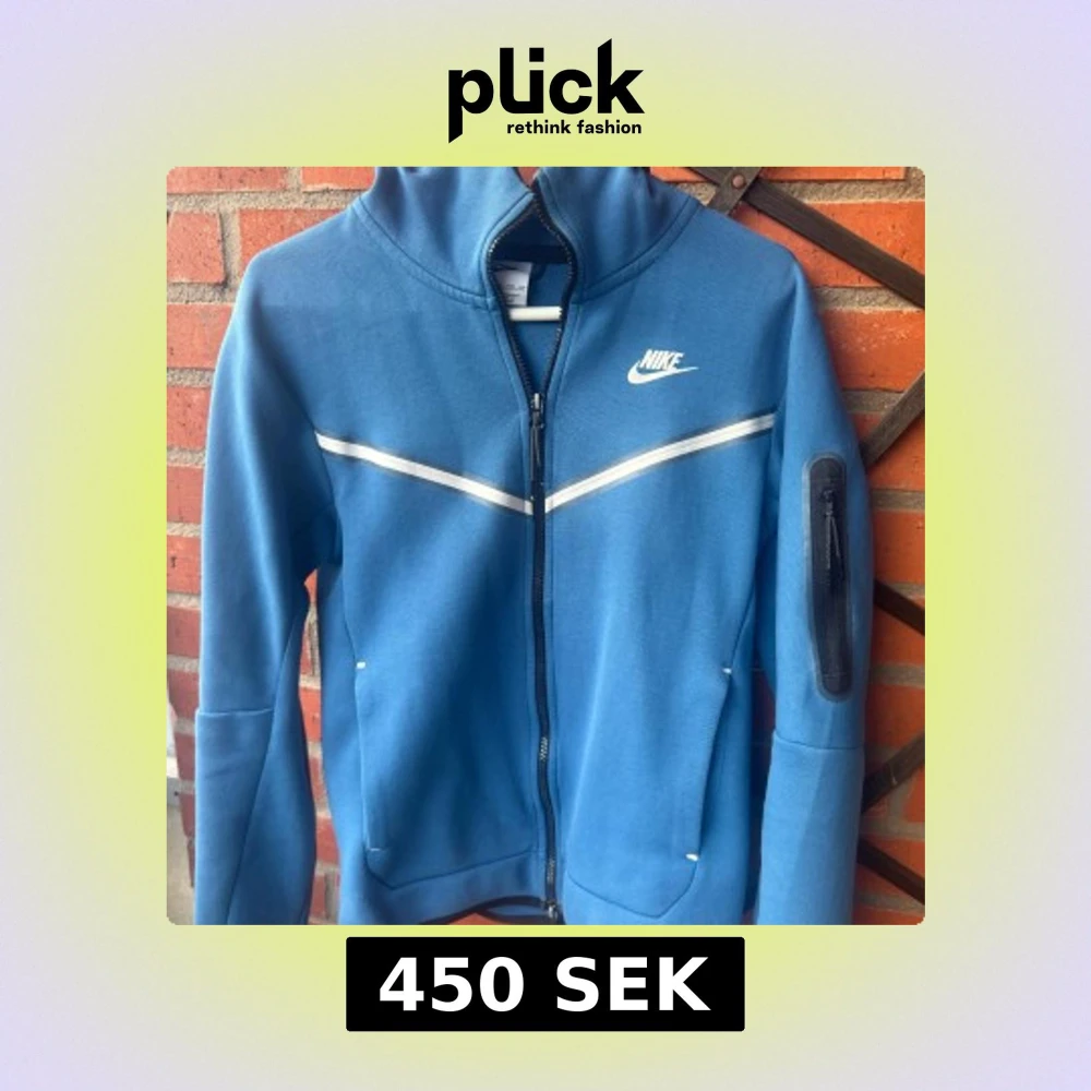 Säljer en blå hoodie från Nike med dragkedja och vit logga på bröstet. Tröjan har en hög krage och en praktisk ficka med dragkedja på ärmen. Perfekt för en sportig look!