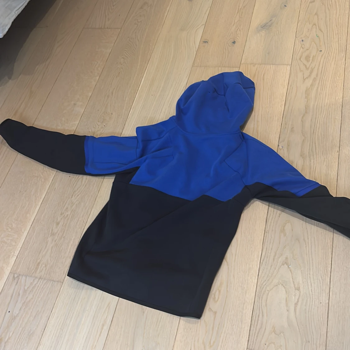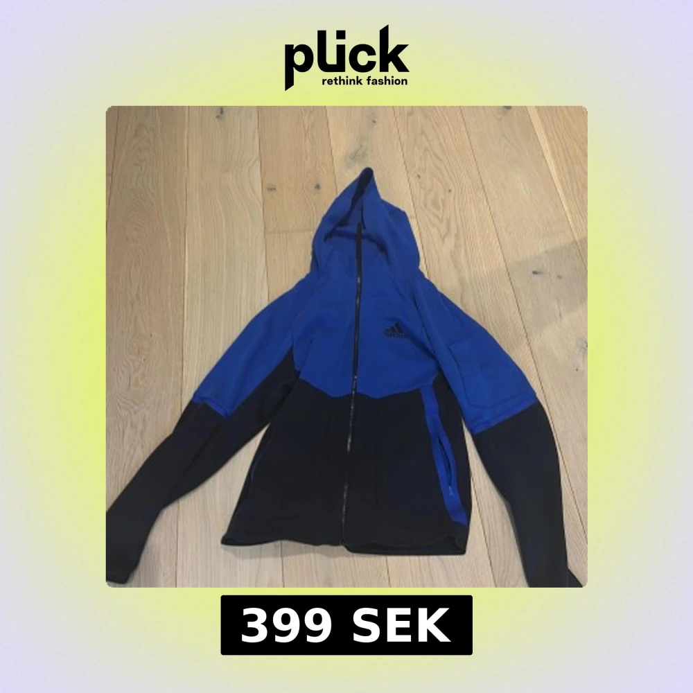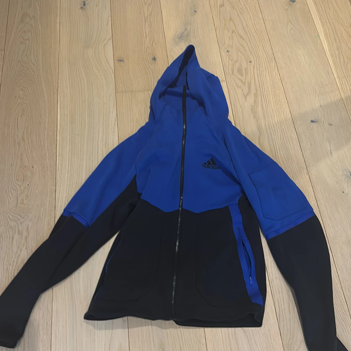 Snygg blå och svart kofta från Adidas med huva och hel dragkedja framtill. Jackan har långa ärmar, två fickor med dragkedja och sportig design. Perfekt för dig som gillar streetwear och vill ha en stilren look.