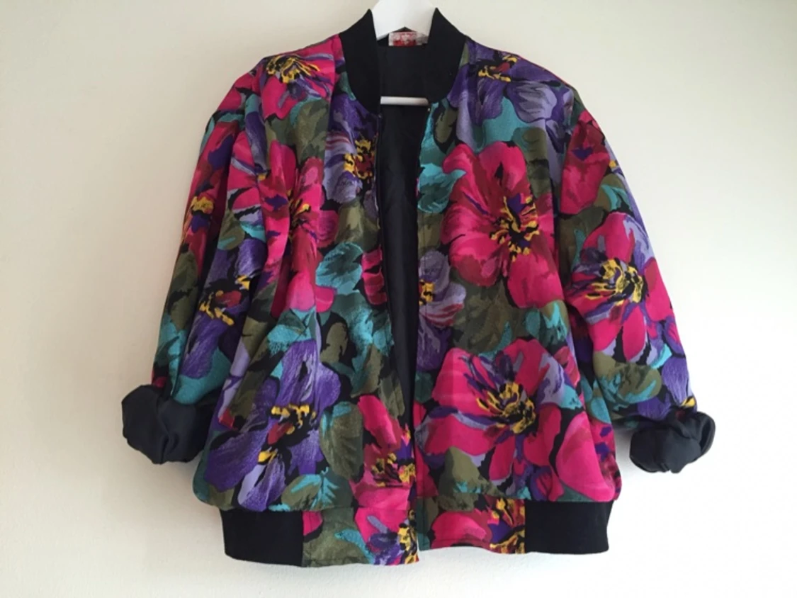 Färgglad, blommig jacka i bombermodell. Storlek M, men passar bra för en S eller XS. Trasig dragkedja.