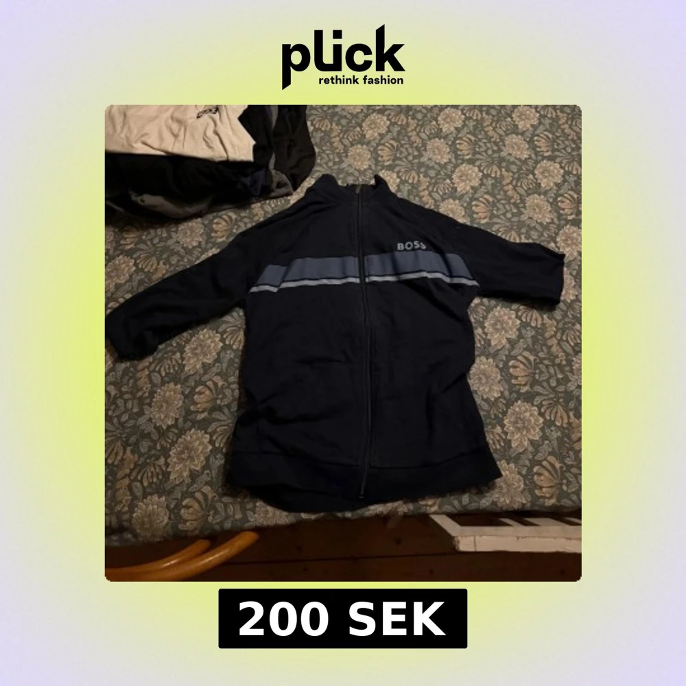 Tja. Håller på och rensar min garderob. Denna tröjan kommer inte mer till användning och därav försöker jag sälja den billigt. Tröjan är använd men i ett otroligt bra skick. Storlek - S. MVH Hugo, vid fler frågor/bilder vänligen hör av dig. Snygg mörkblå vindjacka från BOSS med ljusblåa ränder över bröstet och hel dragkedja framtill. Jackan har ståkrage, två fickor och är långärmad. Perfekt för dig som gillar sportig och clean stil