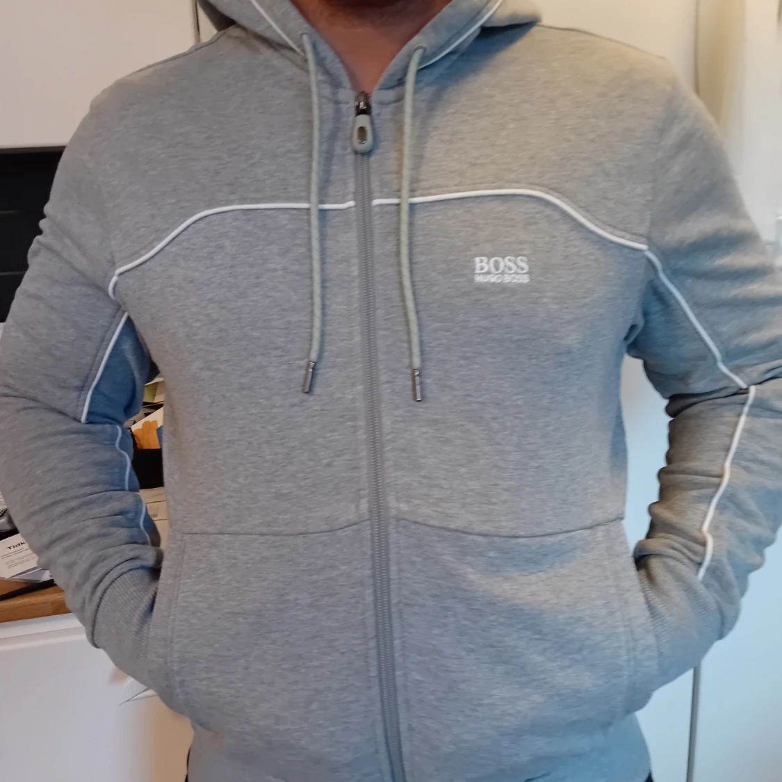 Ljus grå hugo boss hooie zip, skicket är mycket bra inga skador eller hål och fläckar. Priset 550kr kan diskuteras kolla mina andra annonser, nästan bara nya kläder parfymer skor bälte