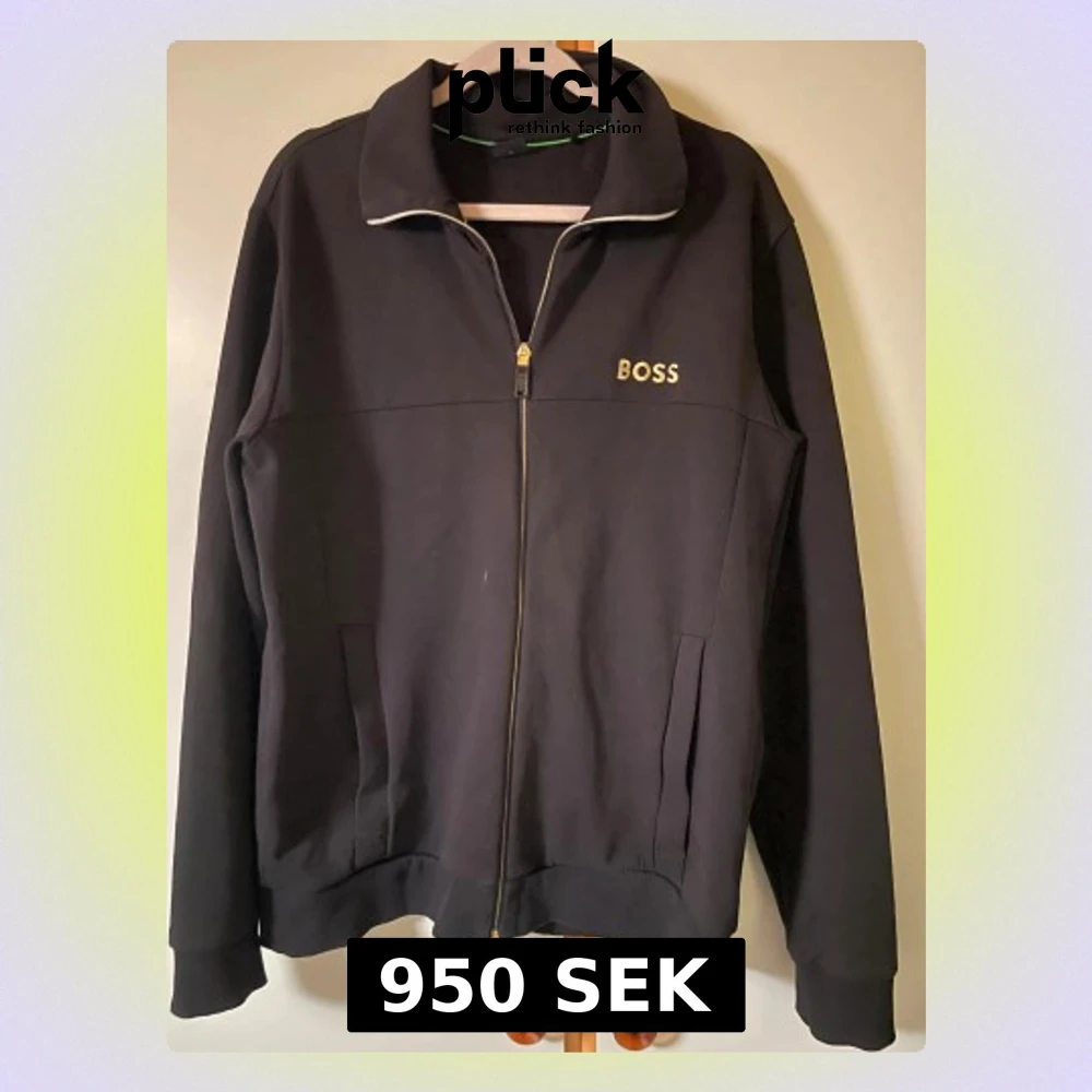 Svart zipjacka från BOSS med guldbroderad logga på bröstet. Jackan har ståkrage, hel dragkedja och två sidofickor. Materialet är mjukt och känns som bomull eller polyester, perfekt för chill dagar. Snygg och enkel design med ribbade muddar. Aldrig använt vill få bort den för den tar plats