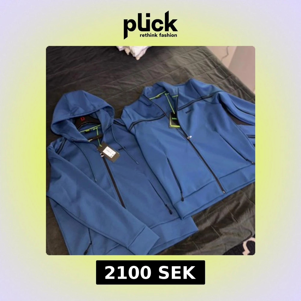 2st blåa ziphoodies från BOSS helt nya oanvända med svarta detaljer och dragkedjor. En jacka har huva med snörning, den andra har ståkrage. Båda har svarta linjer längs axlar och bröst, samt BOSS-logga på bröstet. Perfekt för en sportig och stilren look.
