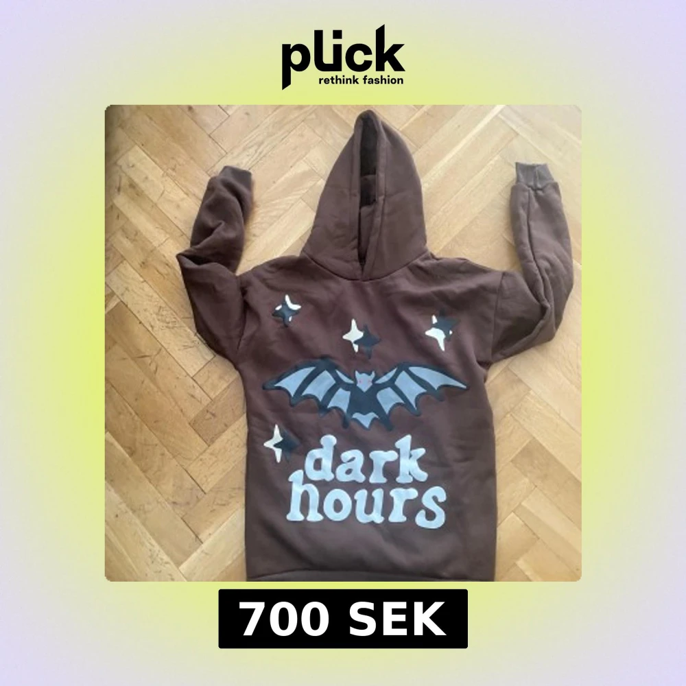 Säljer en brun hoodie från Broken Planet med coolt tryck av fladdermus och texten 'dark hours' på framsidan. Baksidan har texten 'Broken Planet friends & family' och grafiska detaljer. Hoodien har huva och långa ärmar, perfekt för dig som gillar streetwear.